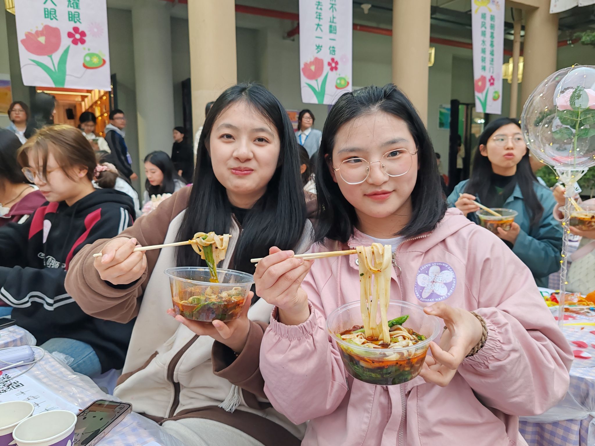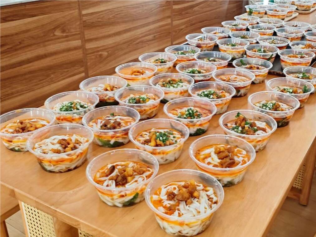 本次生日会活动,观云书院特地邀请到綦江区赶水米粉制作标杆企业进校,为师生寿星煮了100碗热气腾腾的赶水手工米粉。开火、起锅,米粉根根轻薄透亮,再搭配上莴笋、空心菜、秘制臊子等料头,入口爽滑香软。“粉”上移通,过生日的满足感,尽在这一碗綦江味道!