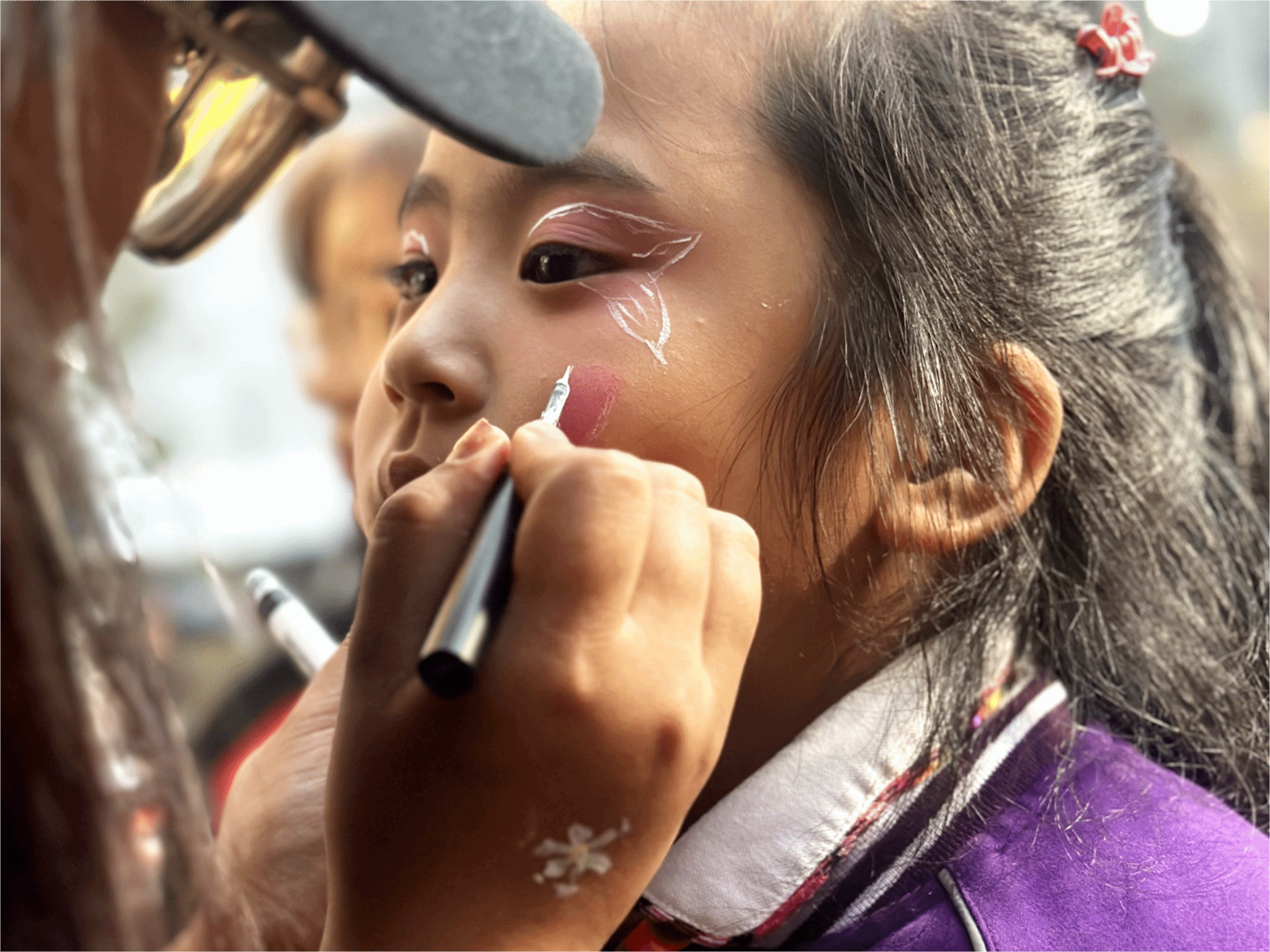 仪式结束后,编发、面部彩绘、迷彩体验等特色摊位向寿星们开放。活动现场有趣的、真切的体验,将每个人的兴趣和感受“置顶”,通过亲和的、真切的、无缝的感受和体验,正向引导青年构建乐观、有趣、有意思的生活状态。