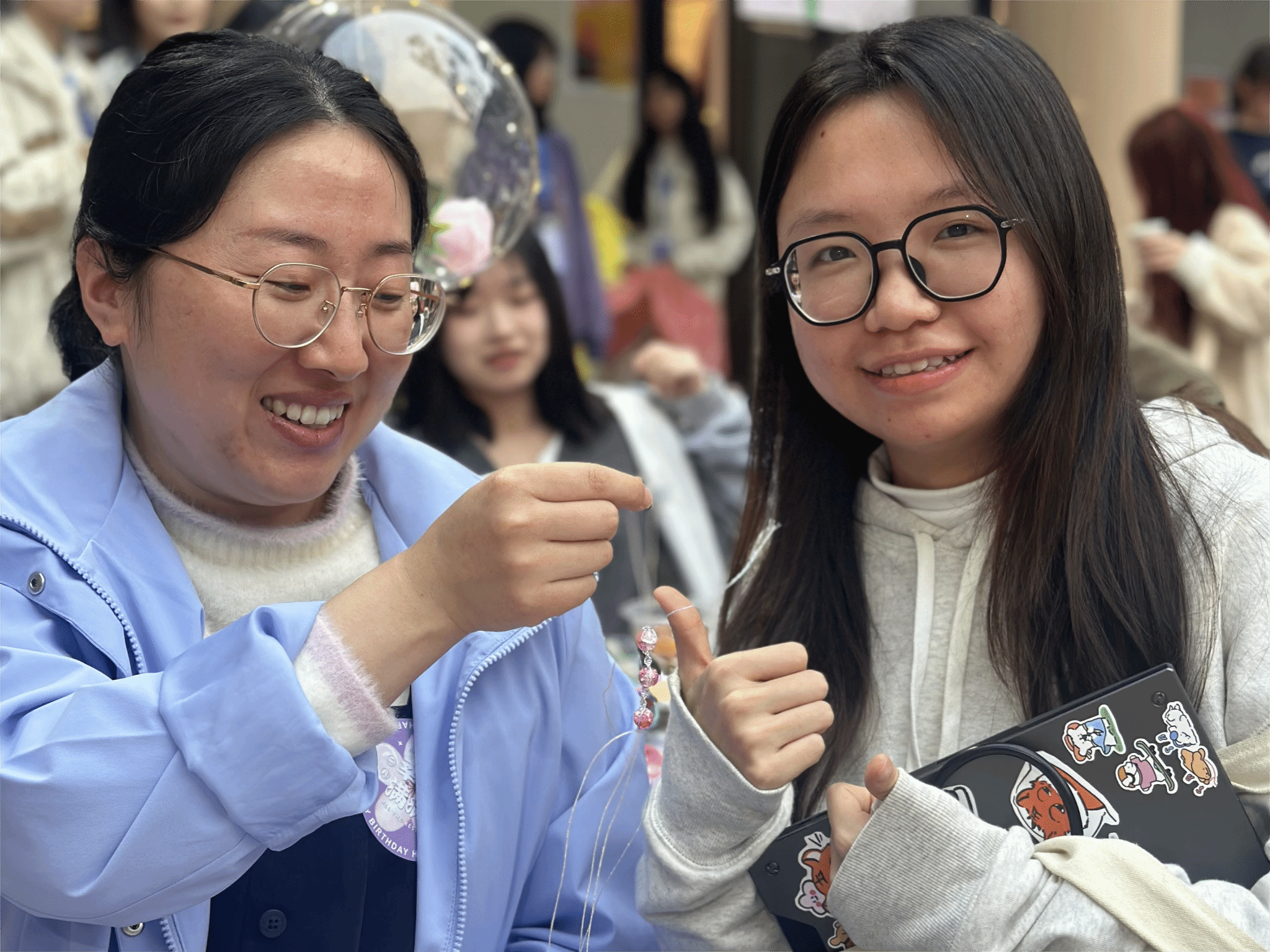 不止做其他人的“粉”丝,更要做自己的“粉”丝。活动现场,观云书院特意为寿星们准备了2000余颗带有汉语拼音字母的彩珠,用来编制粉嫩的桃花手绳,也寓意着福气和顺遂。在工作人员的引导下,寿星们根据自己的喜好选择带有不同字母的串珠,制作了专属幸运生日手绳。