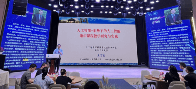 下午王万良教授又以"人工智能+形势下的人工智能通识课程教学研究与实践"为主题,以人工智能通识课程的教育理念思路、教学内容、教学方法、教学资源和课程思政五个方面向大家详细讲述了人工智能通识课程教学的重要性。同时,从各个角度深入剖析,向教师们分享了关于人工智能通识课程的积极作用,引导教师们应当合理利用人工智能结合传统教学进行创新、努力发展“人工智能+”的新型教育教学新模式。随后,教师们结合自己的实际情况与王教授进行了深入交流,并获得了针对性的回答。王教授提出,教师们需要正确把握人工智能通识课程的内涵与发展脉络,在深入理解人工智能技术的基础上,充分发挥人工智能技术的优势,利用人工智能技术创设智慧学习环境,创新教育理念,设计技术手段丰富多样的教学活动等,提高教师教学的质量与效率,促进教师自身发展的专业发展。