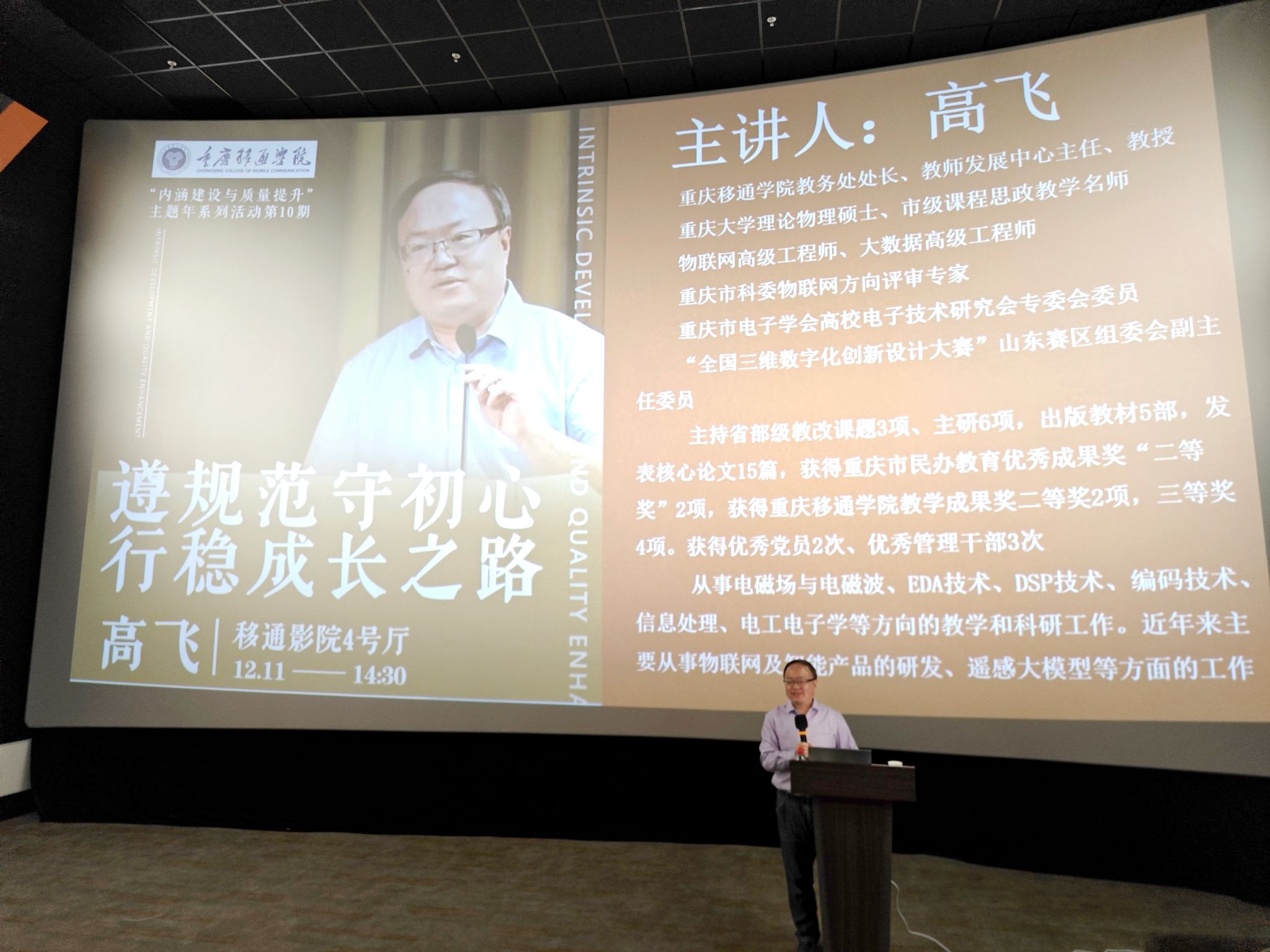 2024年12月11日下午14:30,“内涵建设与质量提升”主题年系列活动第10期在綦江校区电影院4号厅顺利举行。教务处高飞处长开展主题为“遵规范守初心,行稳成长之路”的主题讲座,綦江校区数理教学部和大通识各部门全体教师参加,数理教学部陈玲副主任主持。