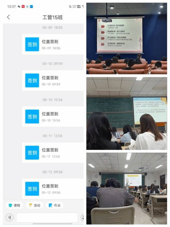 班级出勤率是学风建设的重要指标之一,班级重视课堂出勤率考核,并不断完善优化考核体系。通过手机APP建立学习通班级,使用学习通进行签到打卡,保证每一位同学按时出勤,班级出勤率长期处于百分之百,在此基础上,同学们课堂表现积极,听课质量得到提升,课后作业完成率较高。