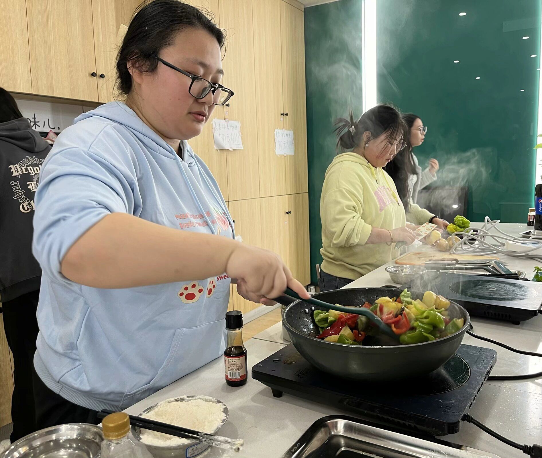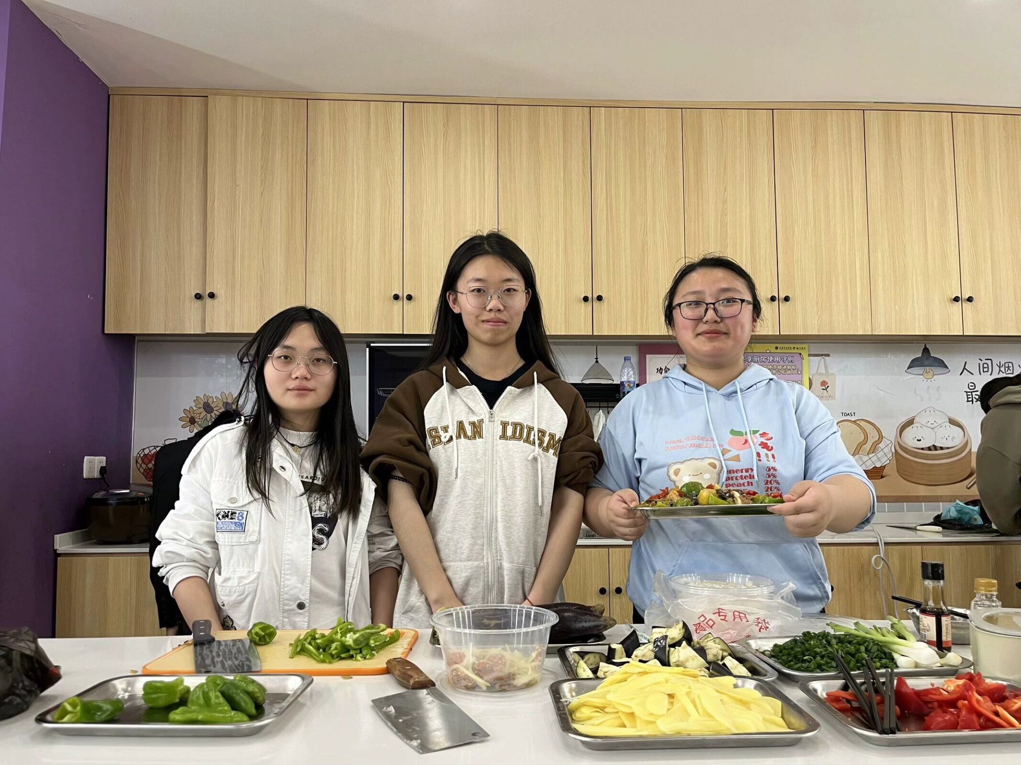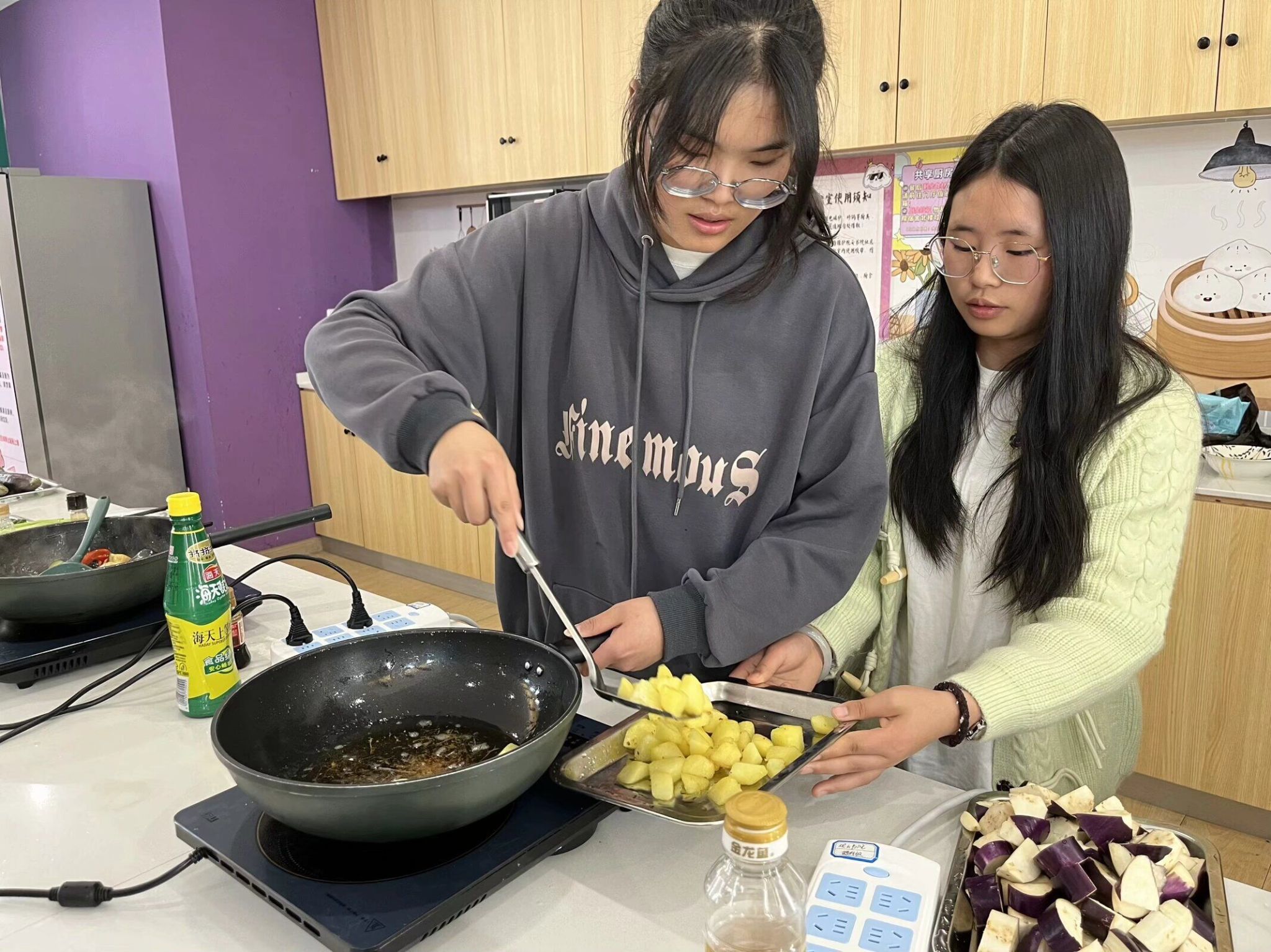 土豆长长直直,茄子弯弯曲曲,青椒歪七扭八,同学们细心熟练地将土豆削皮切块、茄子切条、青椒切丝,下锅便是噼里啪啦。简单的食材在主厨同学的精心烹饪下大放异彩,茄子、土豆、青椒,三味一体,形成层次分明的口感。土豆绵软,茄子嫩滑,青椒爽脆,三鲜出锅,色泽鲜艳,美味妙不可言。