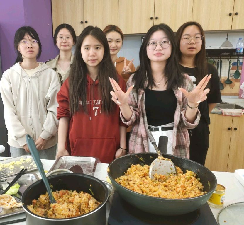 同学们为了将美味一“包”打尽,准备了丰富的食材,并进行了合理的烹饪分工。厨房生手负责淘米做饭以备后用,稍微懂点“厨房规矩”的同学便协助准备各种各样的配料,“高手”就负责制作美味最重要的一环——炒出美味的灵魂鸡蛋酱。