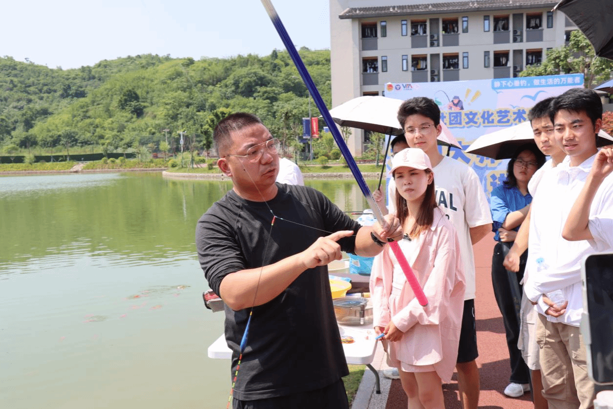 紧接着,刘涛先生亲自在丁山湖畔为师生们进行了实地教学。他详细讲解了调漂、找底、抛竿入水、饵料搭配、看漂提竿等竞钓技巧,并亲自示范操作,让师生们直观地了解到了竞钓的各个环节。在刘涛先生的指导下,同学们纷纷尝试实践,现场气氛热烈而融洽。
