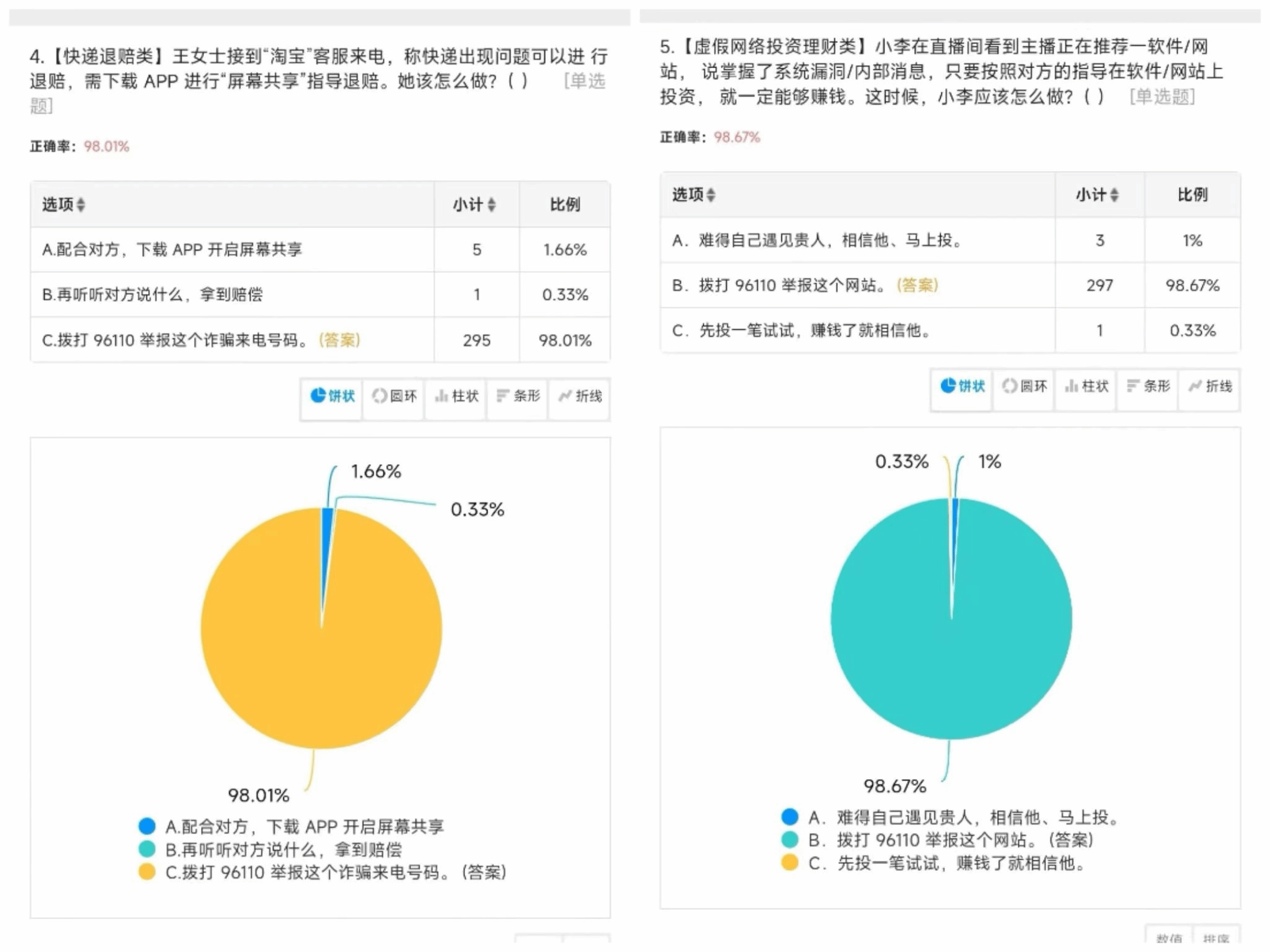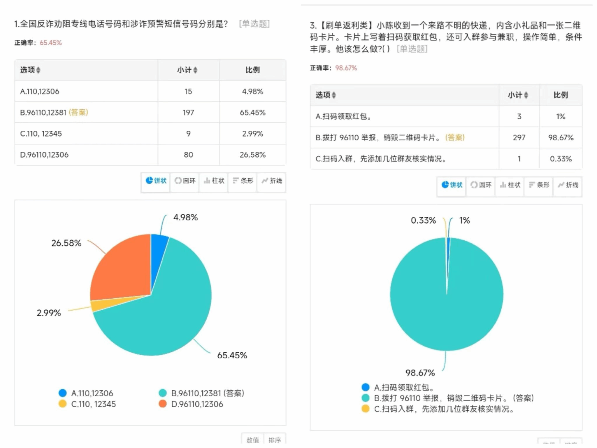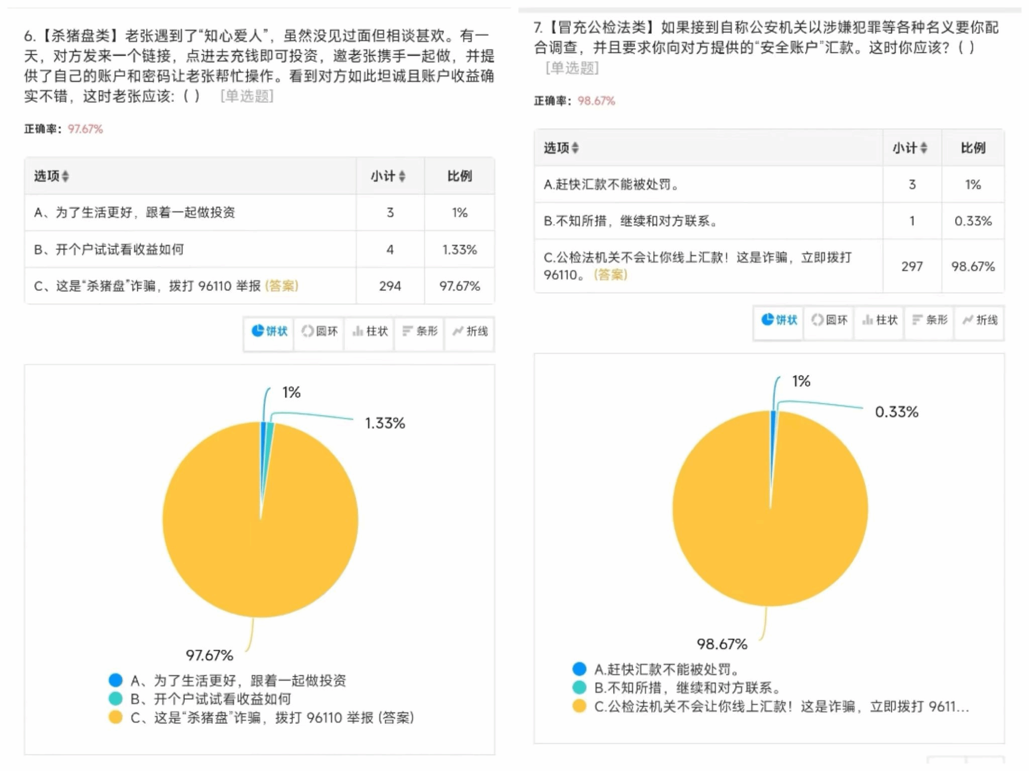 此次反诈咖啡体验日活动共计收到有效问卷301份,通过对问卷分析发现,绝大多数在校大学生对于诈骗信息都有较强的识别能力,对于分辨网络诈骗、“杀猪盘”、网络兼职、网购退款等诈骗信息都有较高的防诈意识。