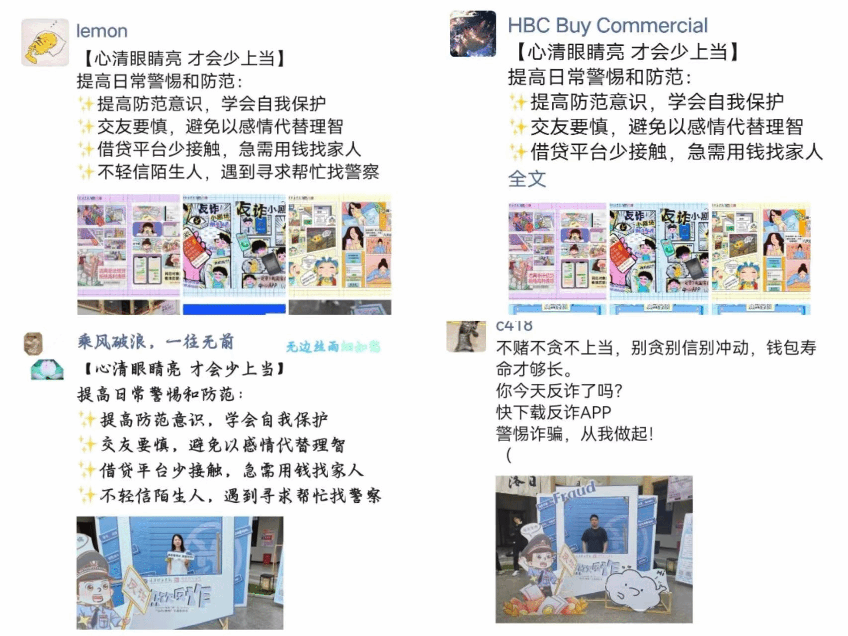 来到“反诈打卡点”,拿起宣传标语,整理好表情,咔嚓!记录下专属“反诈风采”,反诈防诈不是一个人的战斗,联合好友组队防诈,将今天所学到的防诈反诈小知识带回家与家人分享,时刻谨记“捂紧口袋多留神,资金安全有保障。”