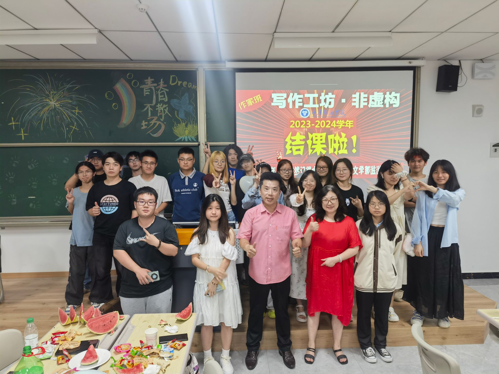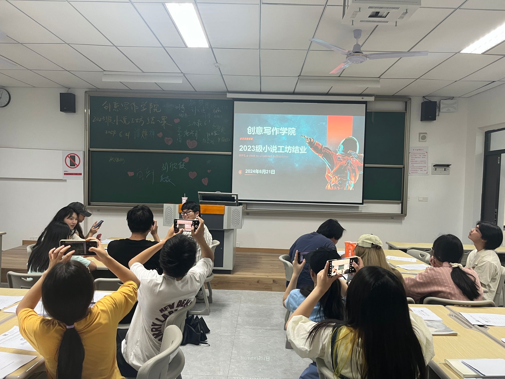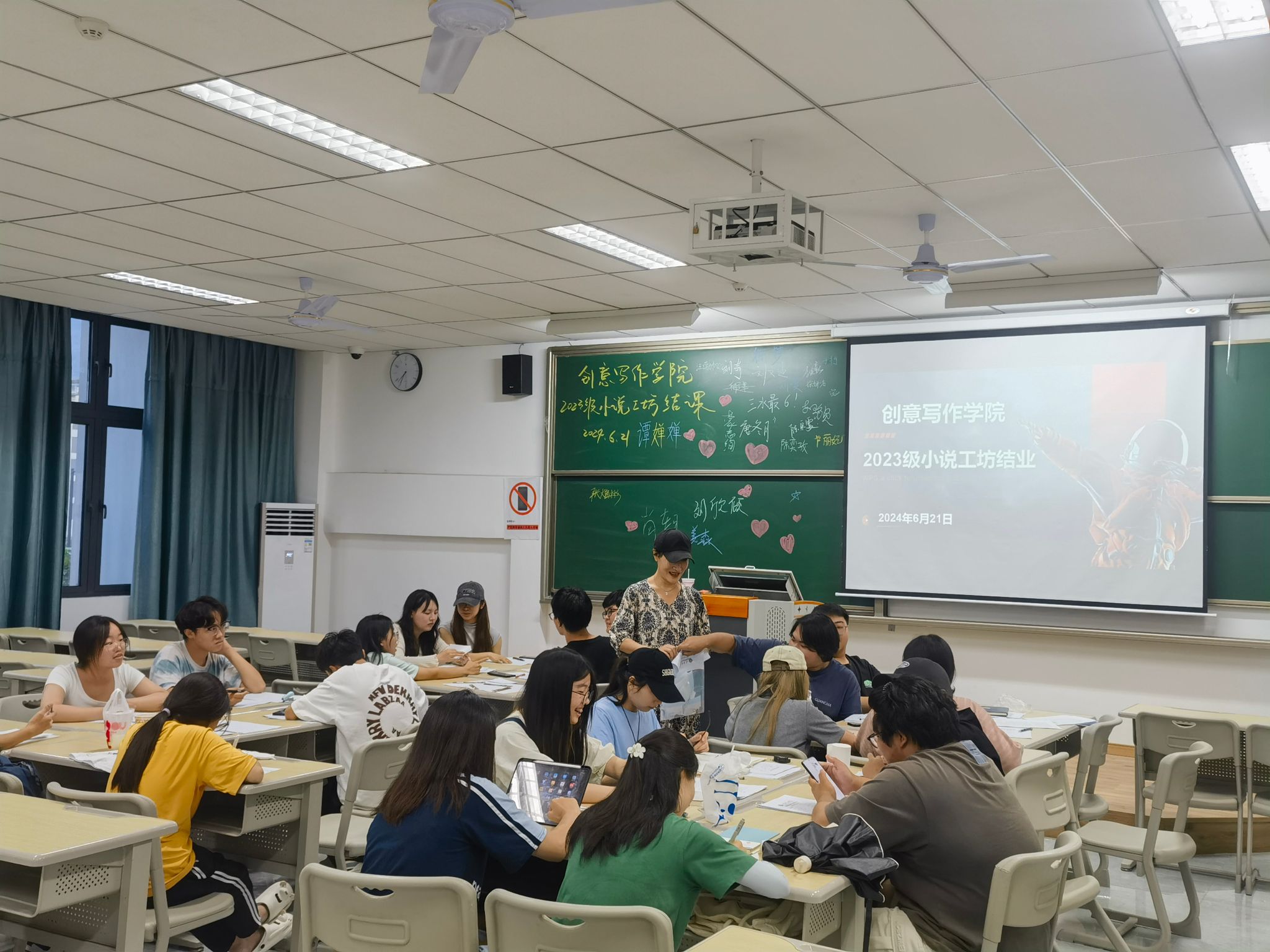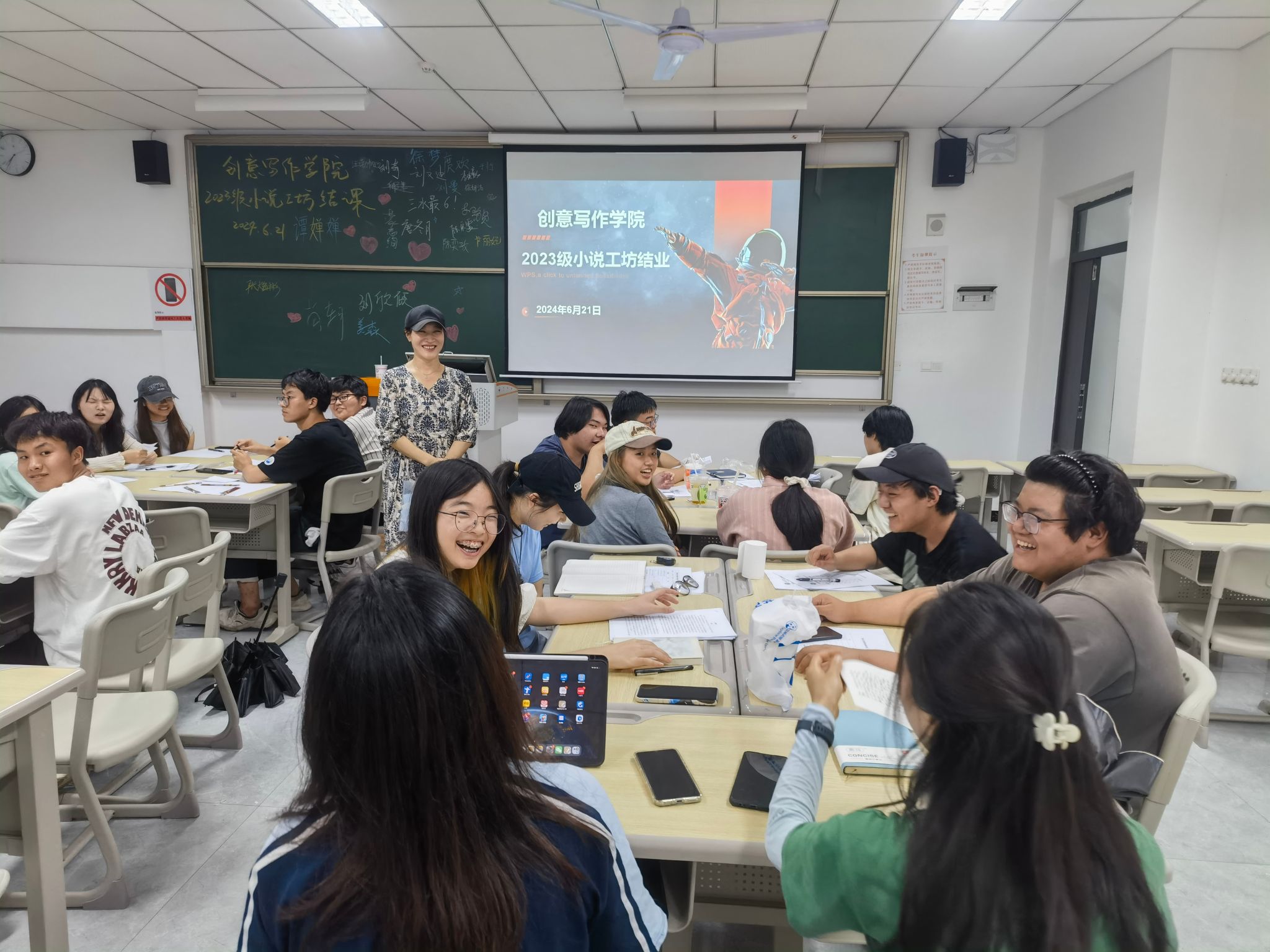 2023年6月21日晚,随着最后一堂课的铃声响起,创意写作学院作家班的大结课如期而至。同学们怀揣着对作家班的热爱,走过了这段充满挑战与收获的旅程。五个工坊班,都弥漫着浓浓的离愁别绪和依依不舍之情。这一年里,作家班同学像一群勇敢的探险家,探索着未知的文学领域,大家学会了如何捕捉灵感的火花,如何将内心的情感转化为笔下滚烫的文字。他们感恩遇到的每一位老师,是他们用智慧的光芒照亮了同学们前行的道路。
