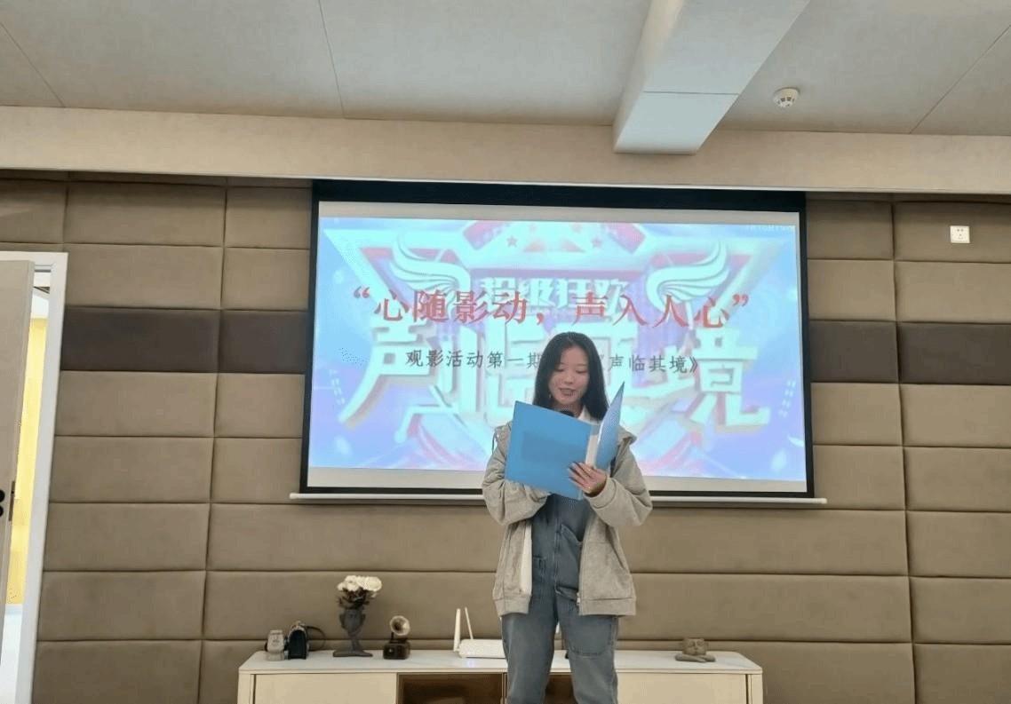 活动伊始,随着大家入座,主持人用幽默有趣、生动激昂的开场白宣布活动开始。灯光渐暗,荧屏闪烁,《声临其境》开始放映,该影片是一场声音魅力竞演秀,声音表演是主线,在节目当中,嘉宾们通过为影视内容配音、台词表演以及同场互动的方式进行比拼,将同学们带入声音所表达的情境,随着配音开始,同学们目不转睛,紧跟着配音开始了一场心灵深处的奇妙旅行。