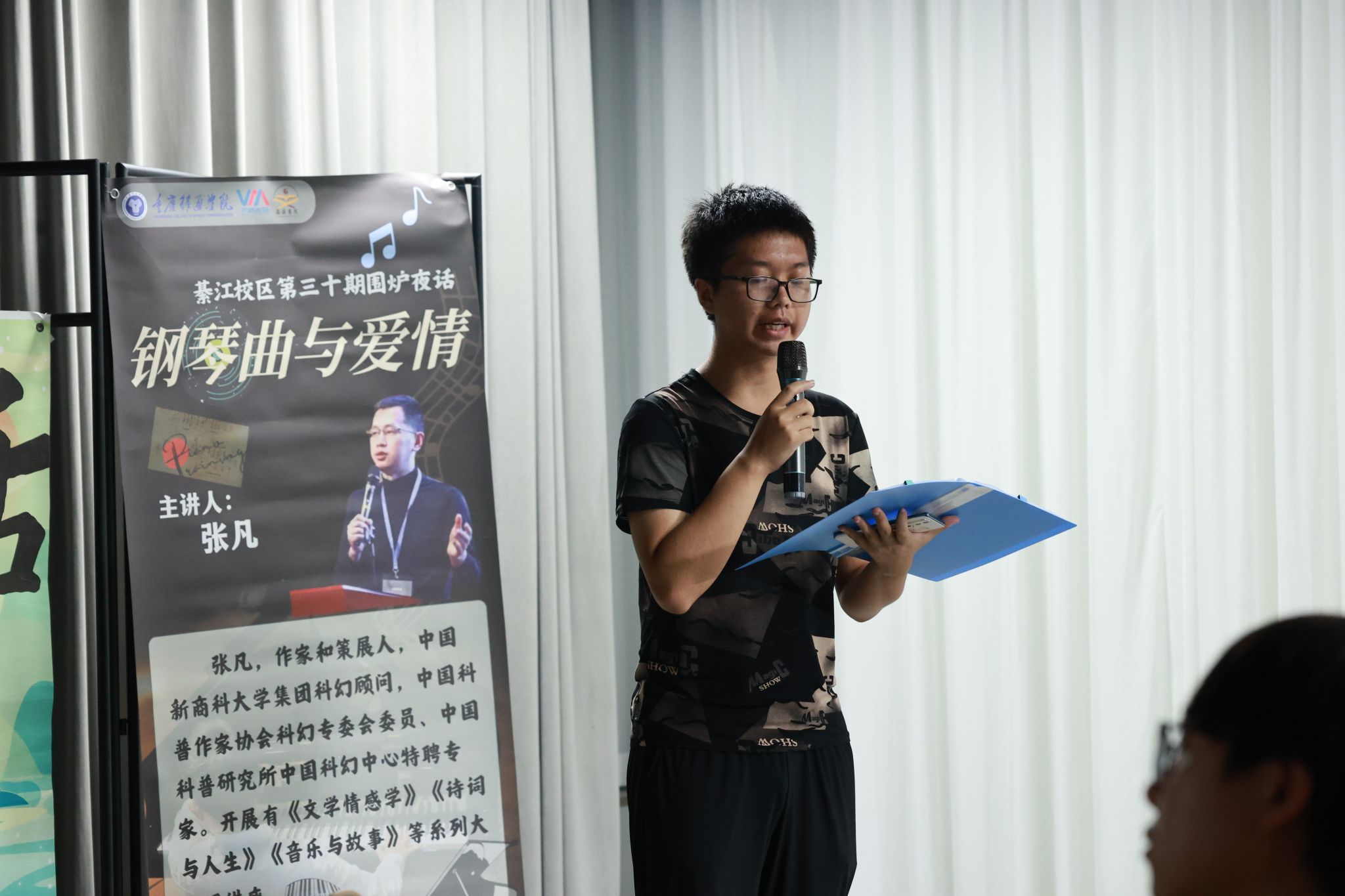 本期有幸特邀主讲嘉宾为中国科普作家协会科幻专委会委员、中国科普研究所中国科幻中心特聘专家——张凡教授。大咖嘉宾就主题“钢琴曲与爱情”与书院学子共同开启本期围炉夜话,围绕这一问题展开深入对话,共同探讨钢琴曲与爱情之间的“爱恨情仇”。