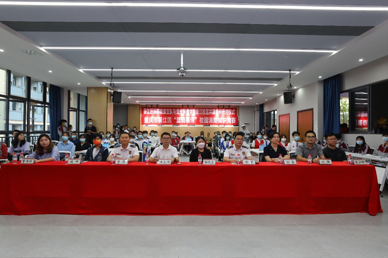 5月27日上午,我校与綦江区消防救援支队举行了“大学生社会实践基地、人才培养基地”签约揭牌仪式。仪式在我校綦河书院观涛多功能厅举行,常务副校长王永周、副校长孙玺,綦江区委宣传部部务会成员、区文联副主席潘晓容,区消防救援支队政治委员徐星、副政治委员曾伟、重庆外语外事学院綦江校区保卫处处长魏娜等领导出席签约仪式。校区安稳办成员代表、消防指战员、学生代表等89人见证了签约仪式。