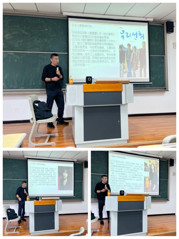 随后,张老师介绍了洪尚秀是如何表现尴尬的:第一,无法自控的知识分子情欲。洪尚秀电影里的知识分子大多数是色情狂,喝了酒之后,无法控制自身情欲,只想用最快的速度与身边的女性发生关系。这种醉酒后最真实的赤裸与直白本身就是尴尬的一种。而洪尚秀电影里的女性偏偏又很容易被知识分子气质和廉价的表白俘获,这就形成了另一种尴尬,我们表演爱情,我们野兽一样上床,我们知道一切都是假的,我们是知识分子;第二,令人窒息的巧合。张老师以《夏夏夏》和《我们善熙》两部电影为例,解析洪尚秀如何用令人窒息的巧合营造尴尬氛围;第三,出轨和不伦之恋暴露后的尴尬。洪尚秀的电影里用了大量的出轨和不伦之恋的情节,而且总是不经意间让这种恋情暴露出来,给主人公和观众造成强烈尴尬;第四,中年男人的初恋式尴尬。洪尚秀的电影里有大量一夜情,油腻的中年男人遇到女文青,表演尴尬与脆弱,以可怜的状态面对女性,紧张、搓手、暗示、哭泣、无助。尴尬氛围被洪尚秀拉满,可是这些手段通通有效,观众知道那种爱情是假的,可是观众却在享受那种爱情。电影里的女孩也知道那种爱情是假的,她们却也在享受那种爱情。洪尚秀电影总是真实到令人觉得可怕,这也是他的电影中尴尬美学的精髓所在;第五,尴尬的爱情观叙事。作为创意写作老师,我们应该理解“叙事”的重要性。爱情观叙事就是知识分子群体中进行“性”和“情”行为的重要媒介。洪尚秀在《这时对,那时错》《女人是男人的未来》等电影里,经常运用这种在普通观众看来很尴尬的“爱情观叙事”。主角一半是表演孤独,一半是真实感受孤独,并用这种伤痛、落寞和危险吸引异性。