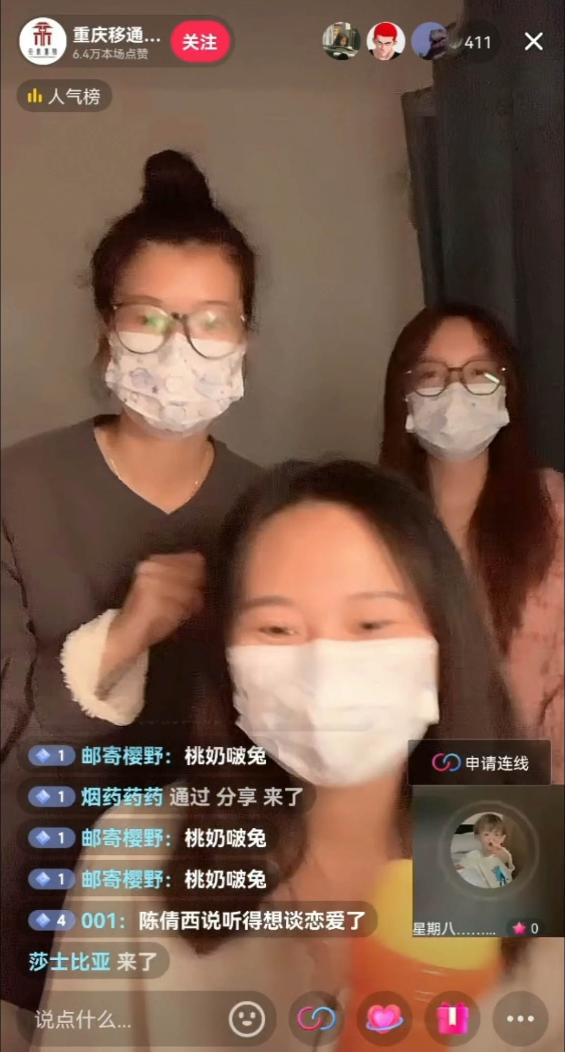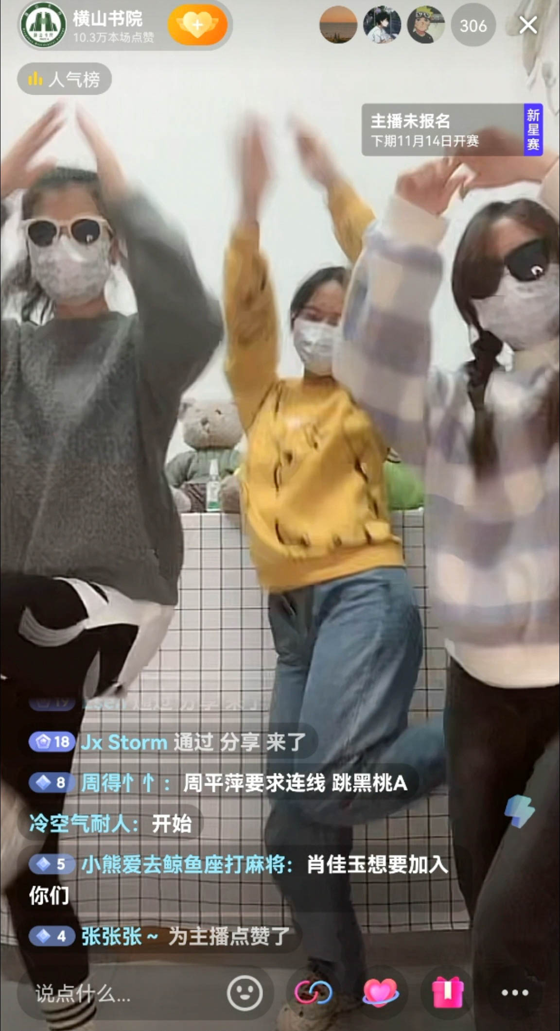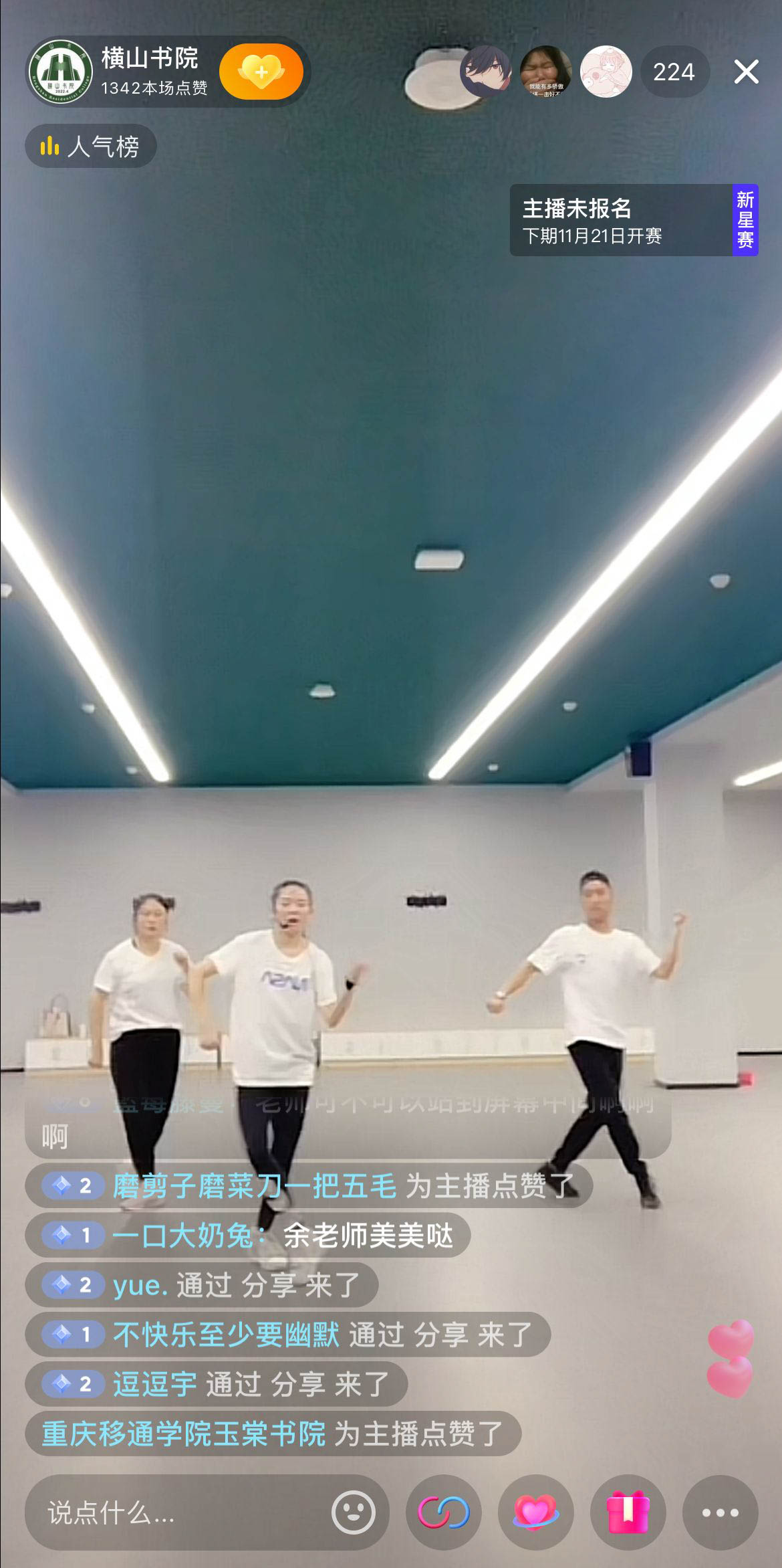 11月12日至11月16日,横山书院与玉棠书院联合开展了“移通二三事”线上直播系列活动,两个书院的三位发展导师分别以我在寝室齐跳操、任何角落跳舞都没差等五个活动板块开展直播互动。老师们用才艺展示、运动舞蹈的方式,与同学们进行线上连麦互动,更有发“合在一綦,移通加油”的弹幕来抽取幸运观众的小环节,通过网络向大家传递爱与信心,缓解疫情下紧张的心情。此次线上系列活动由玉棠书院、横山书院两个官方抖音号交替开展,观看人数一共达1560人次,最高点赞达12万+,各书院官方抖音号也被更多同学所熟知,账号粉丝量倍数性增长。