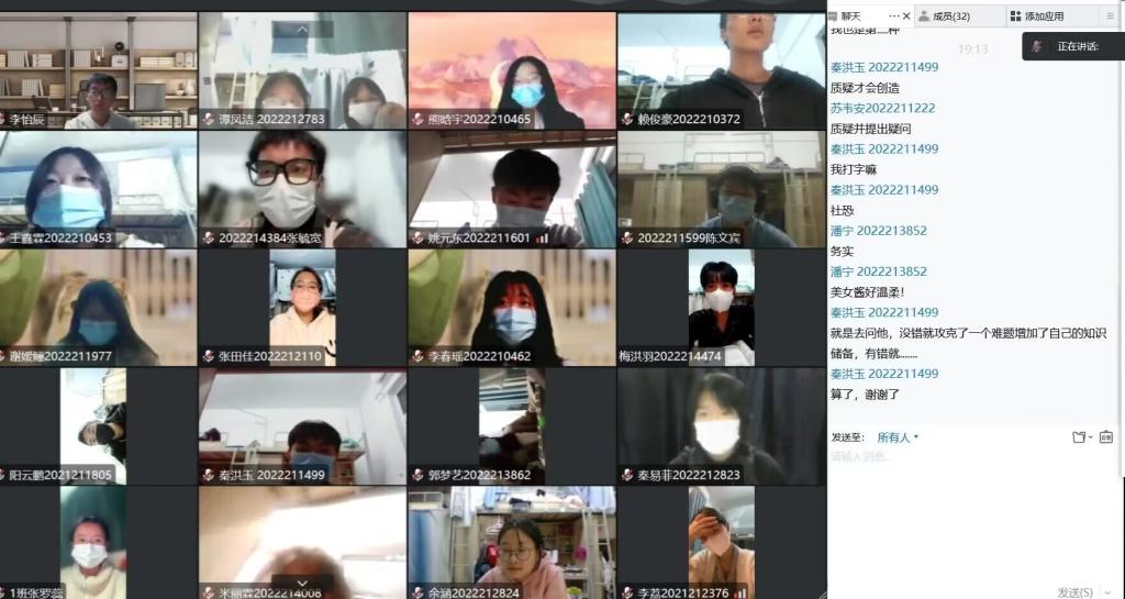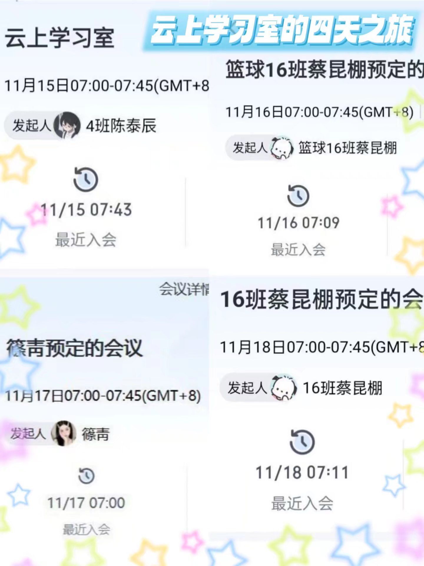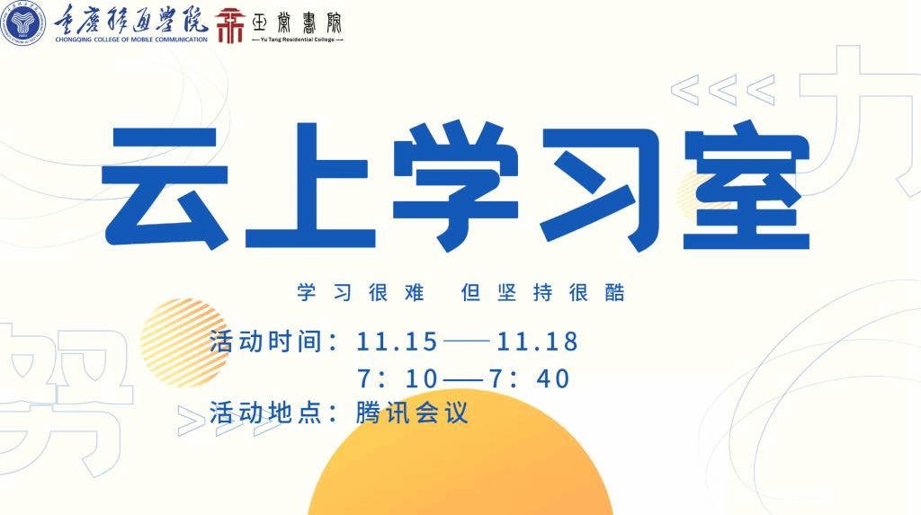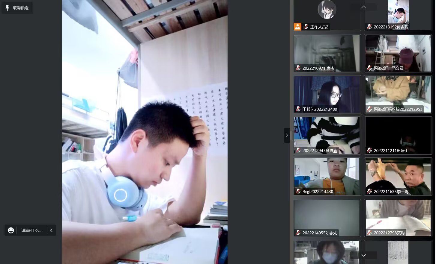 云上学习,拒绝拖延!11月15日,为激励每位学子在寝室也能奔向学习的海洋,在腾讯会议开展为期四天的云上学习室活动。活动期间,大家都准时进入会议并开启摄像头,根据提前制定好的学习计划,开始新一天的学习。其中,令人印象深刻的是,部分未报名的同学也自愿参与当中,共同陪伴学习。