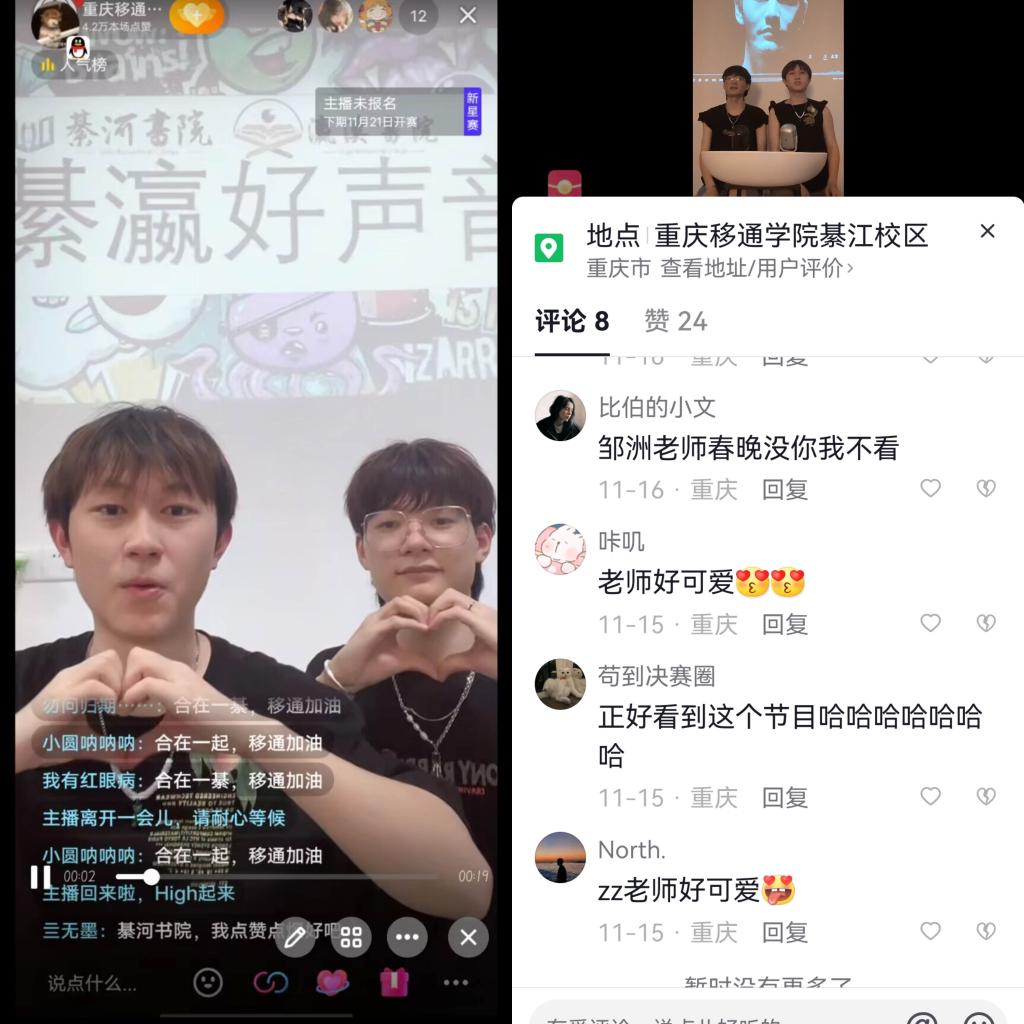 11月15日,綦河书院与瀛溪书院倾情打造“綦瀛好声音”直播活动,其中两位学生发展导师分享了传统茶艺教学和歌舞表演技巧,还以连麦唱歌的互动形式,开展别样化的导师对话活动,为及时疏导学生情绪,提供了一个良好的平台。