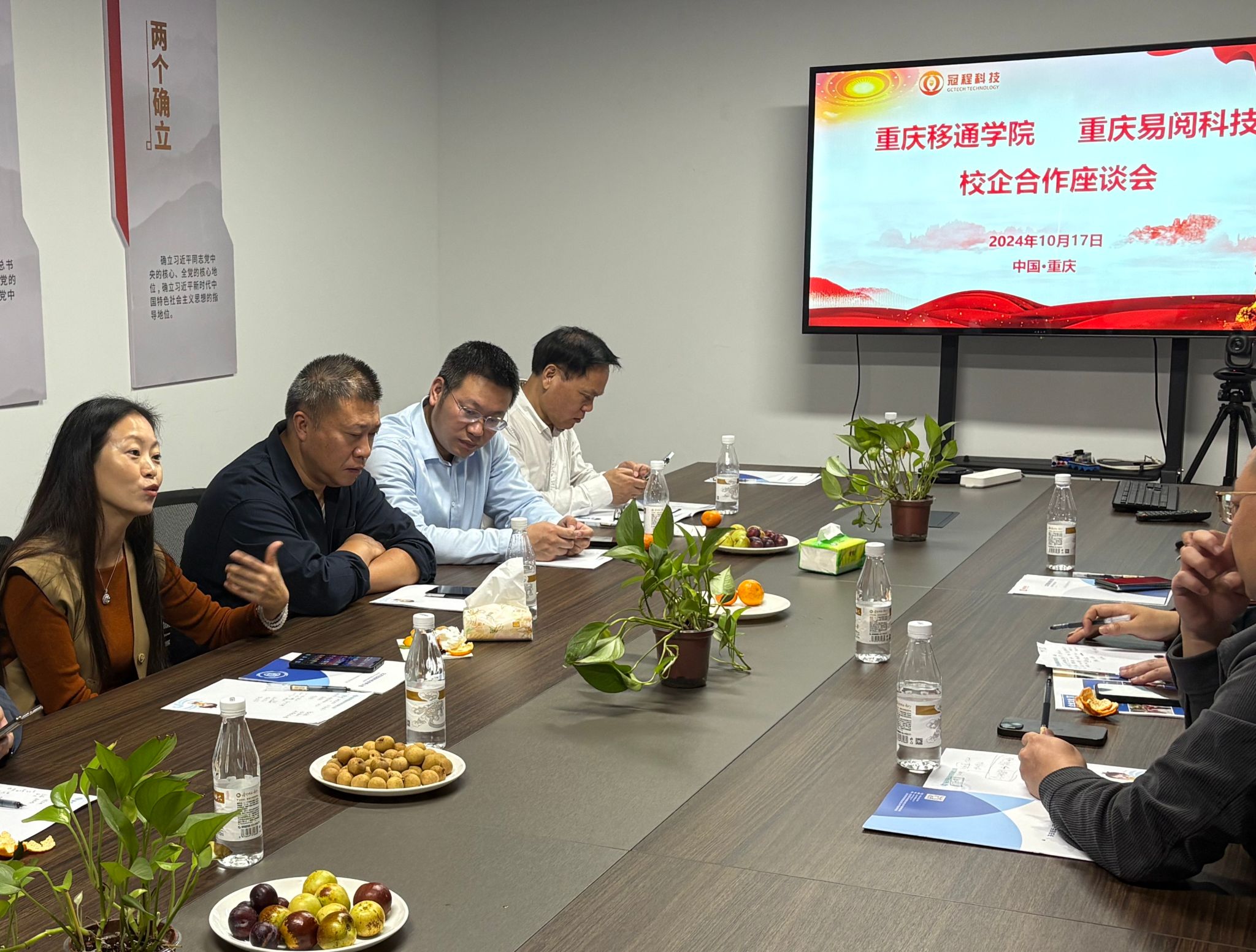 2024年10月17日,重庆移通学院数字经济与信息管理学院院长刘贵容,教学副院长王哲,信息管理教研室主任文豪,大数据学院院长潘显兵,教学副院长吕云山,计算机学院教学副院长林泽金赴重庆易阅科技有限公司进行调研交流,此次调研旨在进一步加强校企合作,共同探索人才培养、专业共建以及学生就业等方面的新合作模式。