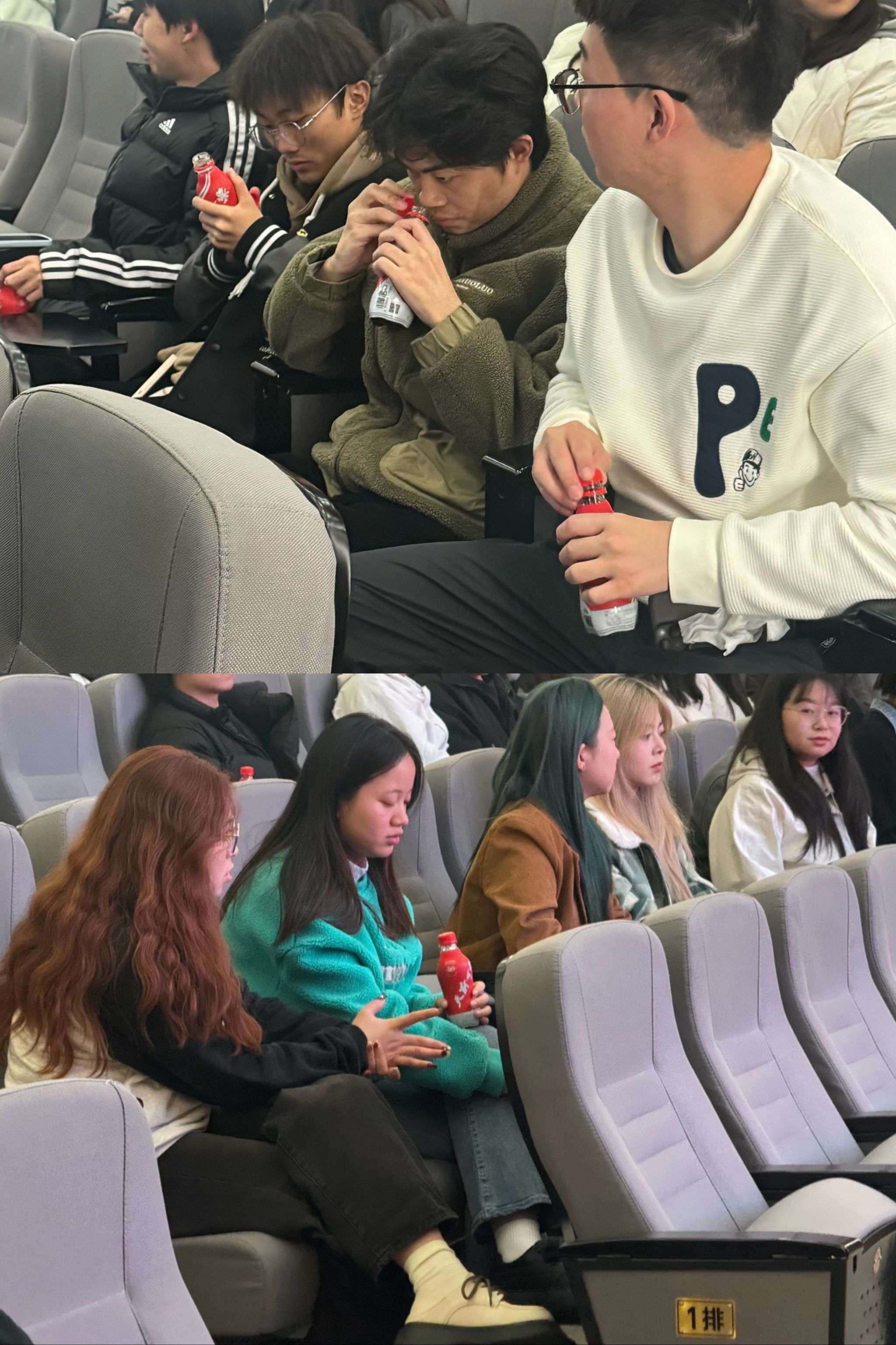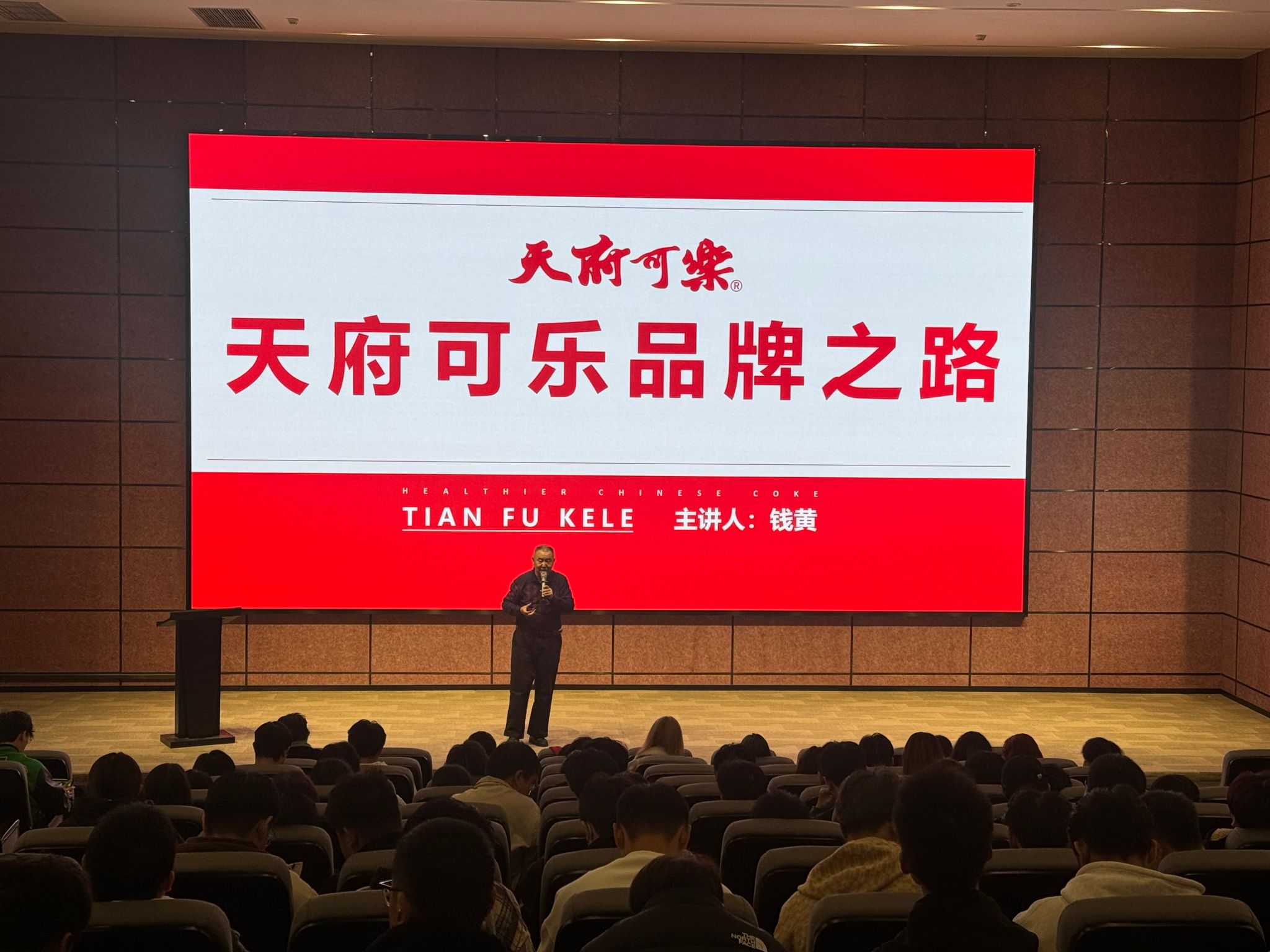 紧接着钱黄先生从企业、产品、未来三个方向讲解了天府可乐的品牌之路。同学们跟随钱先生一起回忆了天府可乐的光辉历史,了解了品牌至暗时刻的故事,见证了如今的焕新荣誉。现场时不时会发出惊叹声和小声称赞。钱先生多次强调天府可乐最大的卖点便是“中药原浆添加、更健康的中国可乐”,这为同学们完成课程作业指明了方向。