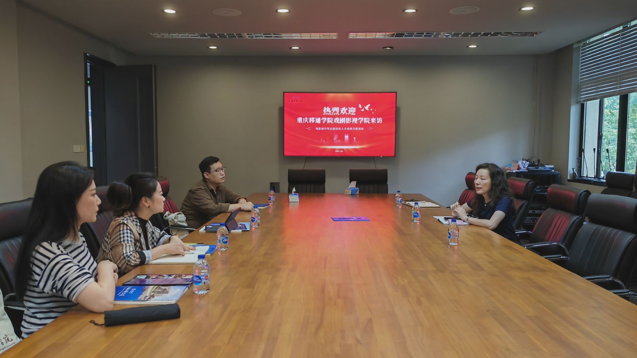 在调研考察期间,上海电影学院党委书记、上海电影特效工程技术研究中心副主任丁友东,电影制作专业主任张莹,上海电影学院实验中心副主任张建荣热情接待了戏剧影视学院调研团队。上海电影学院党委书记丁友东首先对重庆移通学院戏剧影视学院的三名老师表达了欢迎,也表示:“我这次既惊喜于同行院校建设的决心,能够远至上海与我们进行沟通交流。也惊喜于重庆移通学院建设的规模和速度。这次绝不仅仅是戏剧影视学院的老师来向我们学习经验,我们也应当主动向在座的老师请教戏剧影视方向专业建设的新思路和新方法。也希望我们能够建立一个随时沟通、互通有无的平台,能够从老师到学生产生合作和交集。”