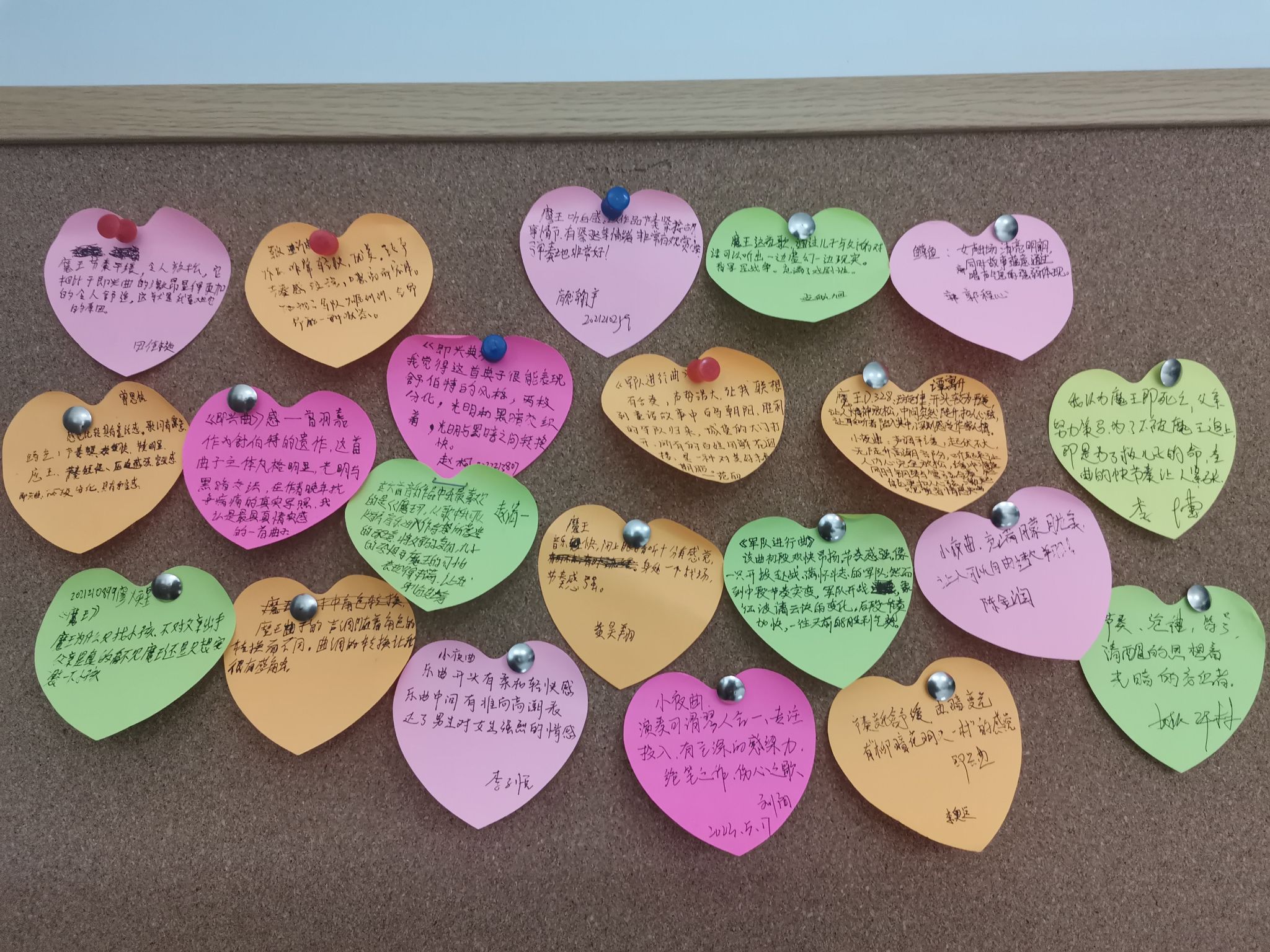 放映结束以后,开始互动交流。在谭老师的询问下,大家投票选出最喜欢的作品《魔王》。根据当时的视听体验,同学们又纷纷在便利贴上写下自己的乐评,工作人员将这些乐评交由老师评选,选出优秀作品并由嘉宾老师颁发小奖品。在分享音乐的过程中,同学们积极发言,为自己喜欢的音乐代言。他们用精湛的笔锋,谱写着青春的乐章,洋溢着灿烂的笑容,尽情展现青春的热烈。