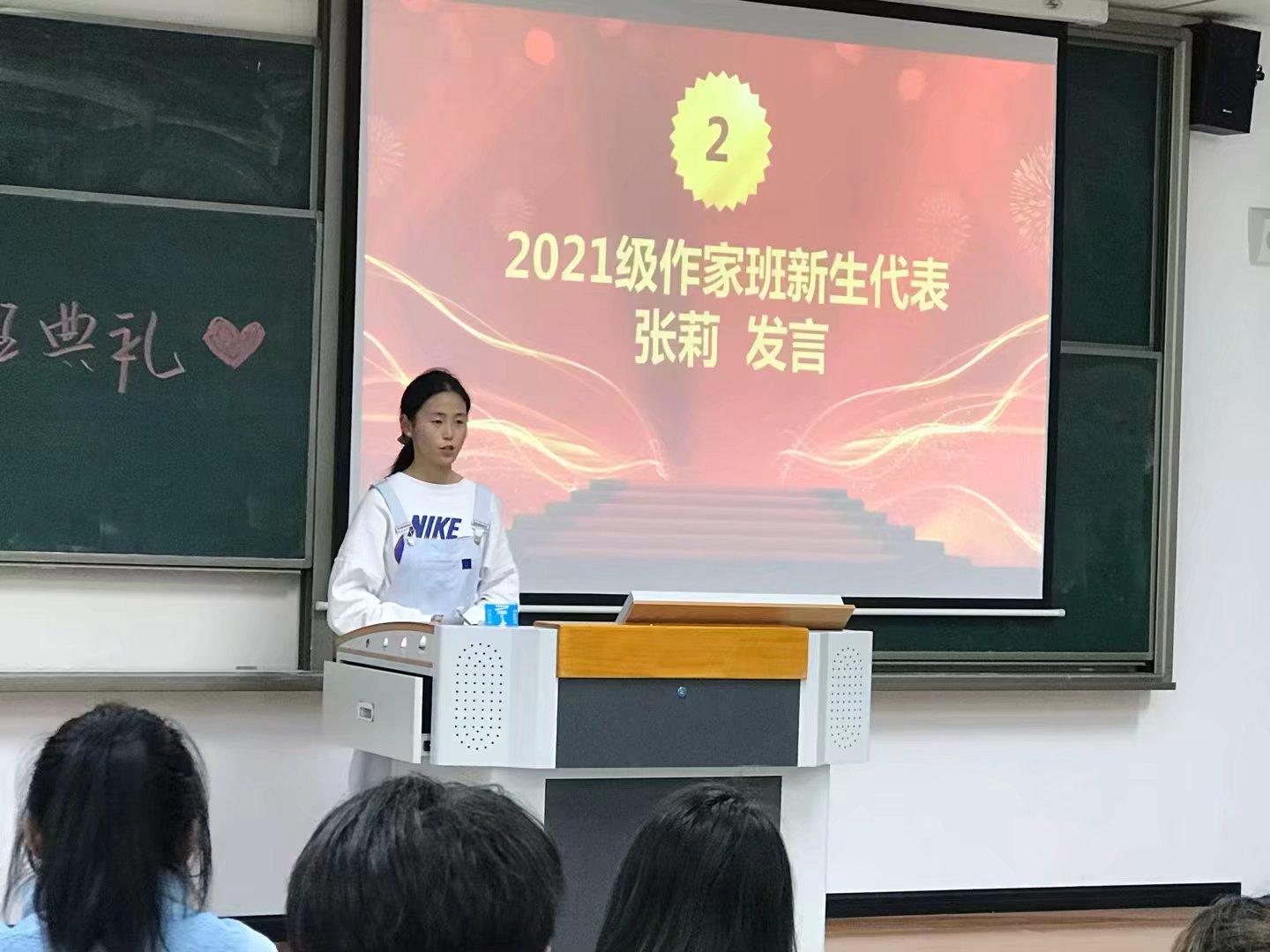 典礼第二项内容便是2021级作家班新生代表张莉同学发言,她说“来到作家班,是我的幸运,以前为了应试教育逼自己去记那些条条框框,可在我内心中是抗拒的。当我没按老师的要求来时总是给我不太高的分数。我觉得这使我的思维受到了局限,可我来到作家班感觉就不一样了,我可以自由的发挥,思维可以无限的发散,再也不用担心老师对你奇怪的想法而横加指责。”