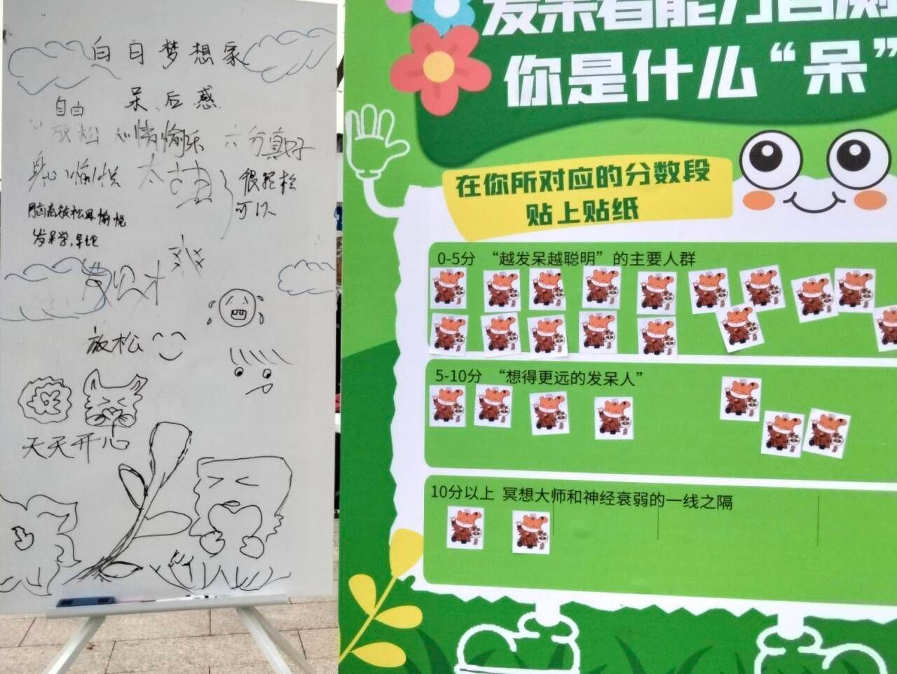 天梯发呆显专注,平日里恐于攀登的天梯,此刻却是发呆冥想的绝佳之地。本期以自测开启发呆旅程,三分钟自测从发呆的初级、中级、高级三个阶段,围绕日常走神、具体情景、心理状态展开,通过问答同学们得到了自己的发呆成绩;随后在主持人的引导下同学们进入发呆阶段,在天梯上,在太阳下,同学们放空大脑,享受此刻的宁静。活动结束后,参与的同学纷纷为本次活动点赞,赞扬发呆的好处,密密麻麻的感言填满活动的留言板,活动的短暂时光让同学们收获许久没有获得的平静。