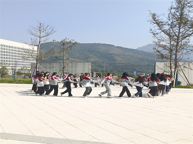 操场上响起熟悉的音乐,同学们陆续来到操场,一排排一列列前后对齐,四个整齐排列的小矩形呈现在大家眼前。热身小游戏开始,伴着贪吃蛇的音乐声响起,只见每个小方块里扮蛇头的同学迅速绕过身边的人,形成一个小小的队伍,接着蛇头又带领这个队伍绕过下一个人,跟着音乐的节奏,这个队伍慢慢变长,直到每个方阵里最后一个同学被整个队伍环绕而过,一个完整的贪吃蛇就形成了,热身活动结束。