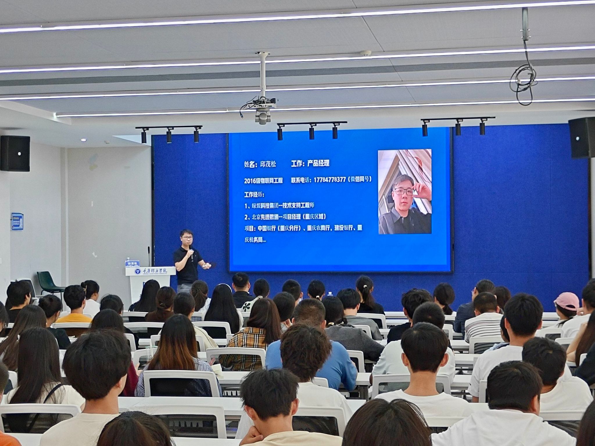 为帮助同学们了解网络安全行业实习实践的市场背景、就业前景,解决迷茫与困惑,掌握相关经验与求职技巧,由就创中心主办、信息安全学院承办的綦江校区“校友·成才”主题论坛第九期暨信息安全学院“信安创星营”系列活动之校友篇第四期——“网络安全,大有可为”主题分享,于10月15日14:00在綦河书院2号楼观涛多功能报告厅开展。本次分享会邀请到我校2016级校友、现任杭州迪普科技股份有限公司重庆办事处产品经理邱茂松,信息安全学院学工办主任邹健,共100余人参与。