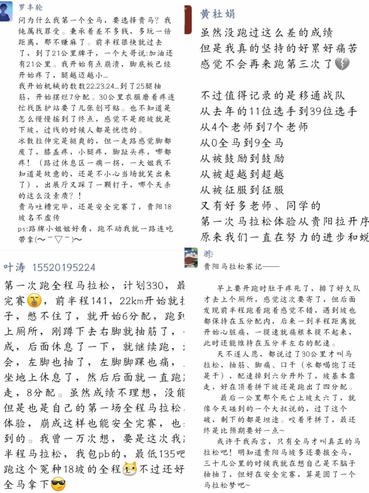 “贵马十八坡,坡坡有惊喜”。贵阳马拉松因坡长、坡多而闻名,或许这些坡就像人生一般跌宕起伏,但当跨过所有坡时,从此路上尽是坦途。人生充满无数次尝试,但必须勇敢地去挑战未曾涉足的领域,不断突破自我,实现个人成长与提升。这是重庆移通学院第2次参加西南地区高校马拉松联赛,团队从最初的11人到现在的39人,从最初的0全马到现在的9全马,这是一次又一次的新突破,也是“最体育的非体育大学”的最好证明,是“人人运动、人人健康、移通师生人人马拉松”口号的完美诠释。