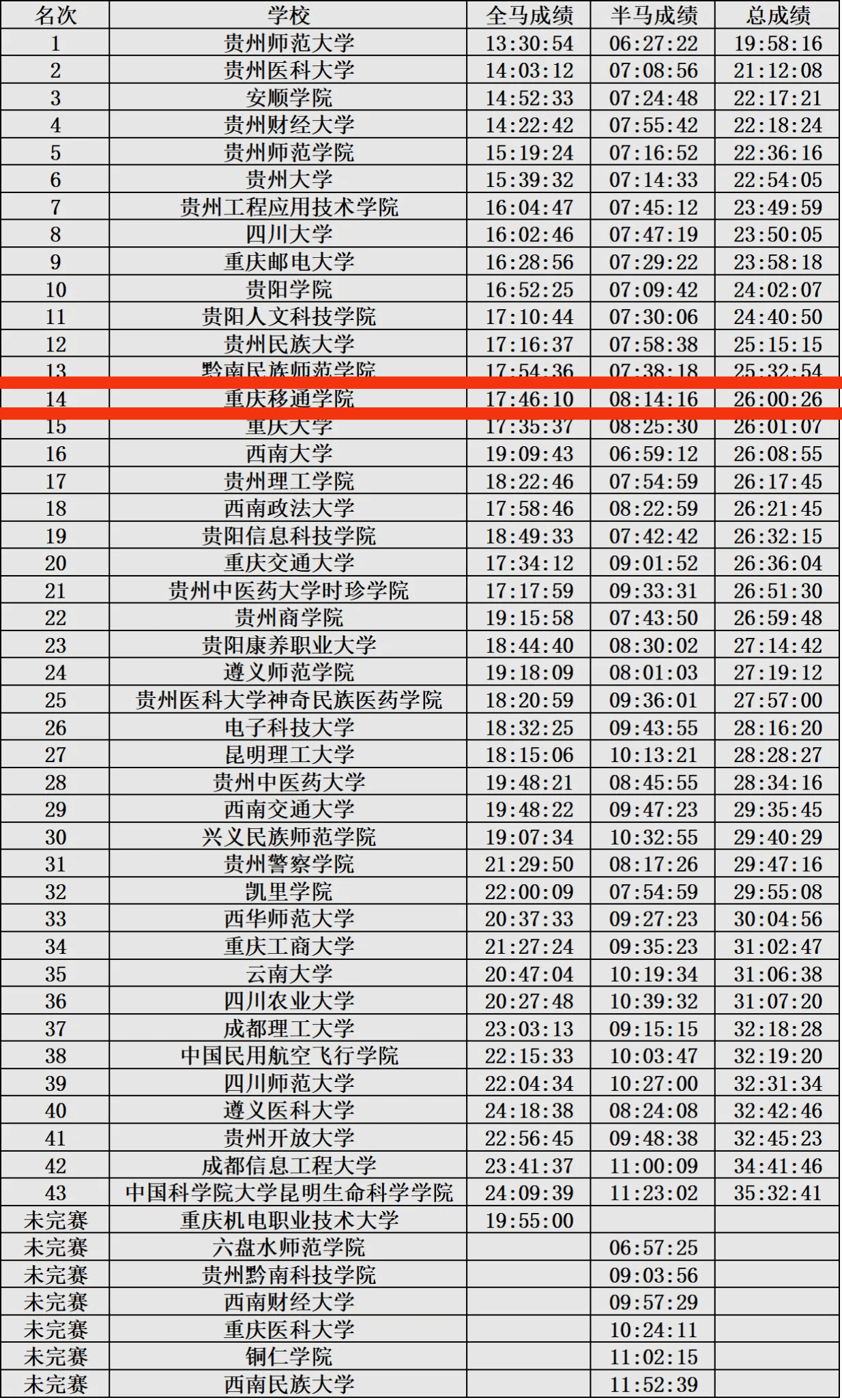 经过早晨的激烈比拼,我校39名师生全部顺利完赛。重庆移通学院与贵马高校联赛的队员们同台竞技,共同作战,用一道道奋力奔跑的身影解读热血奔腾的青春密码,他们为梦想、为热爱、为挑战、为代表高校的荣誉奋力一战!尽管途中肌肉酸痛、抽筋发麻,但他们从未想过放弃,一次次的挑战极限,不停奔跑,只为追赶被寄予厚望的自己。