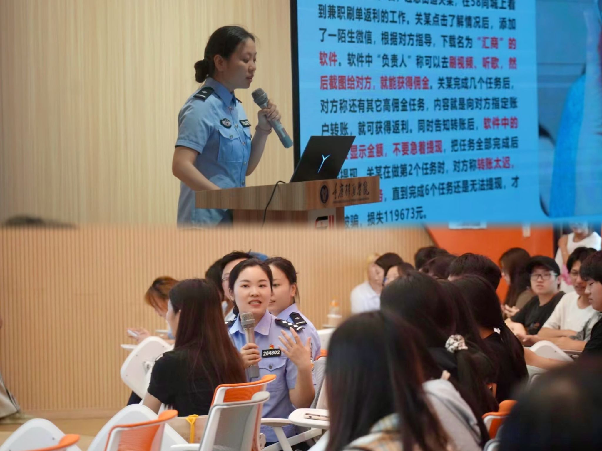 情景剧结束后,綦江区反诈中心周纯真警官为同学们带来了题为“反诈拒赌·你我同行”的反诈科普讲座,用身边最常见的真实案例剖析诈骗案件背后的险恶和黑暗。綦江区反诈中心何容容警官表示:“当前诈骗分子反侦察能力让人防不胜防,大学生是当下网络诈骗的高关注群体,一定要学习反诈知识,学会应对和分析诈骗套路。”