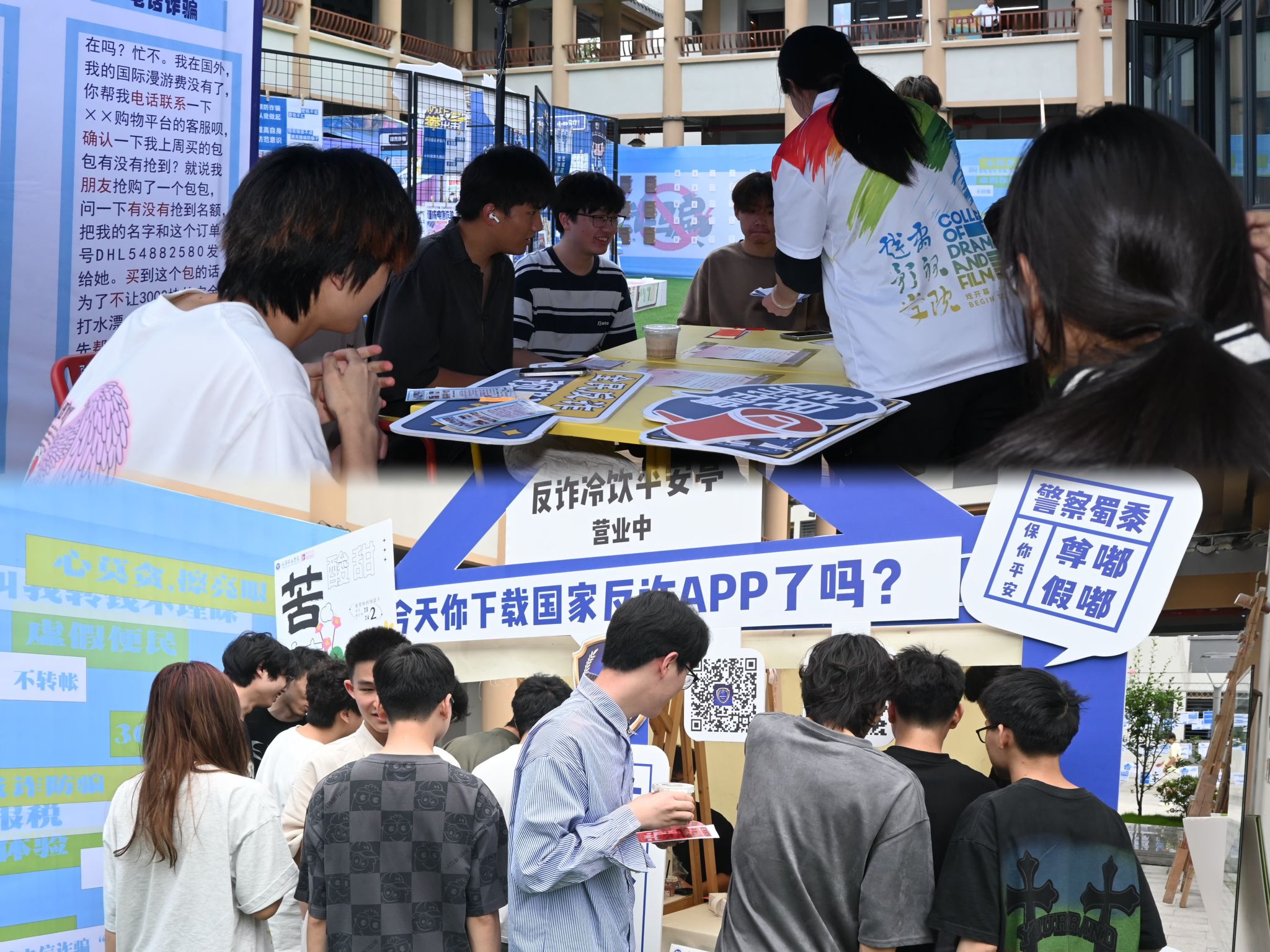 除此之外,现场专门设置老人反诈区,了解和感受保健品与养老金的诈骗风波。反诈档案室、反诈书签墙、诈骗案例集更是吸引广大师生翻阅学习、扫码打卡。现场最受欢迎的反诈冷饮站,特别设置酸、甜、苦、辣味的反诈饮品,激起师生好奇心纷纷驻足排队品尝诈骗的人生百味。反诈快递点、反诈手抄报艺术气息十足,现场吸粉无数。反诈翻翻乐、真假诈骗局、火眼金睛识骗术等游戏互动热火朝天,各路反诈研究员一波接着一波,古剑书院热闹非凡。