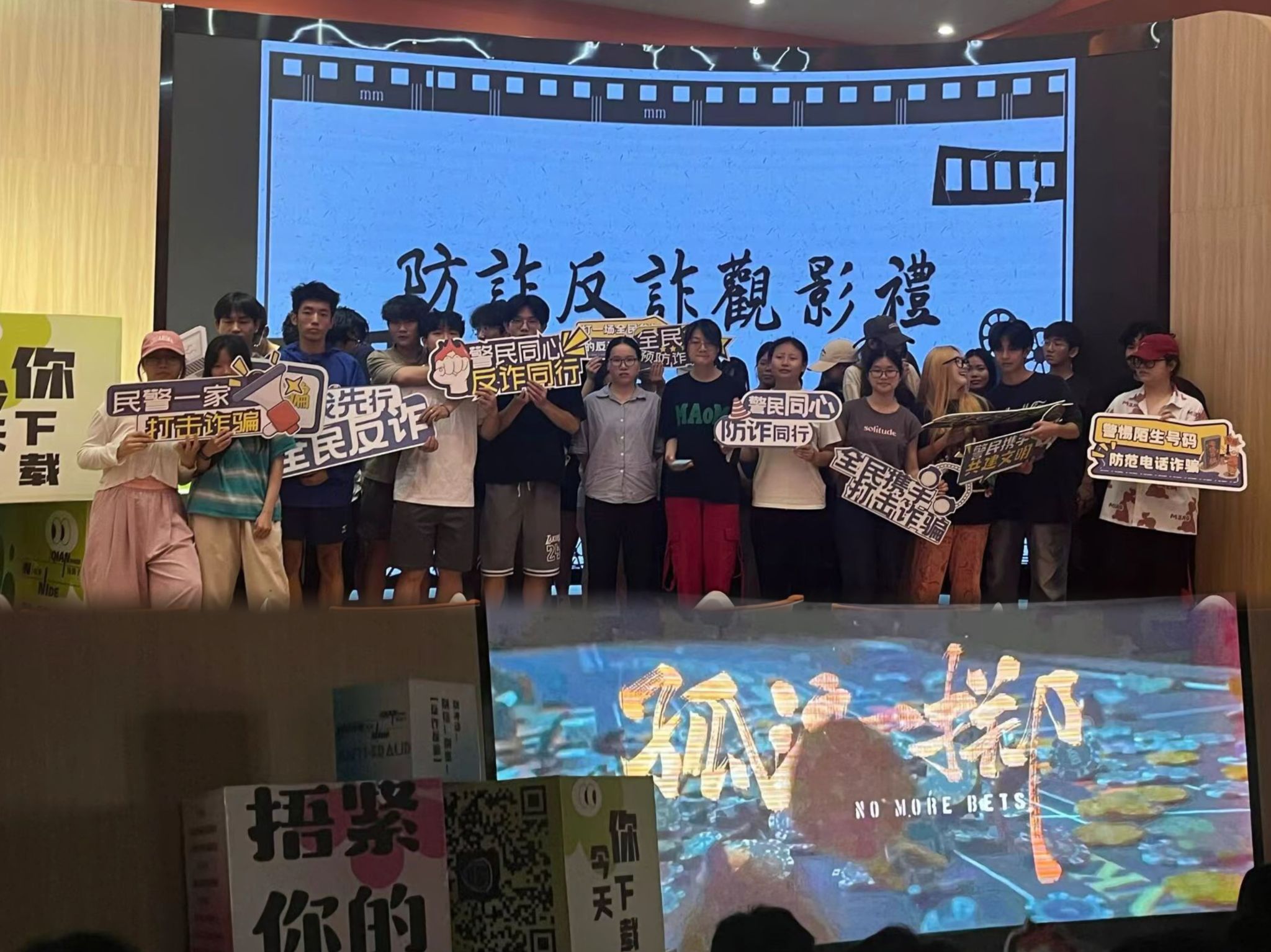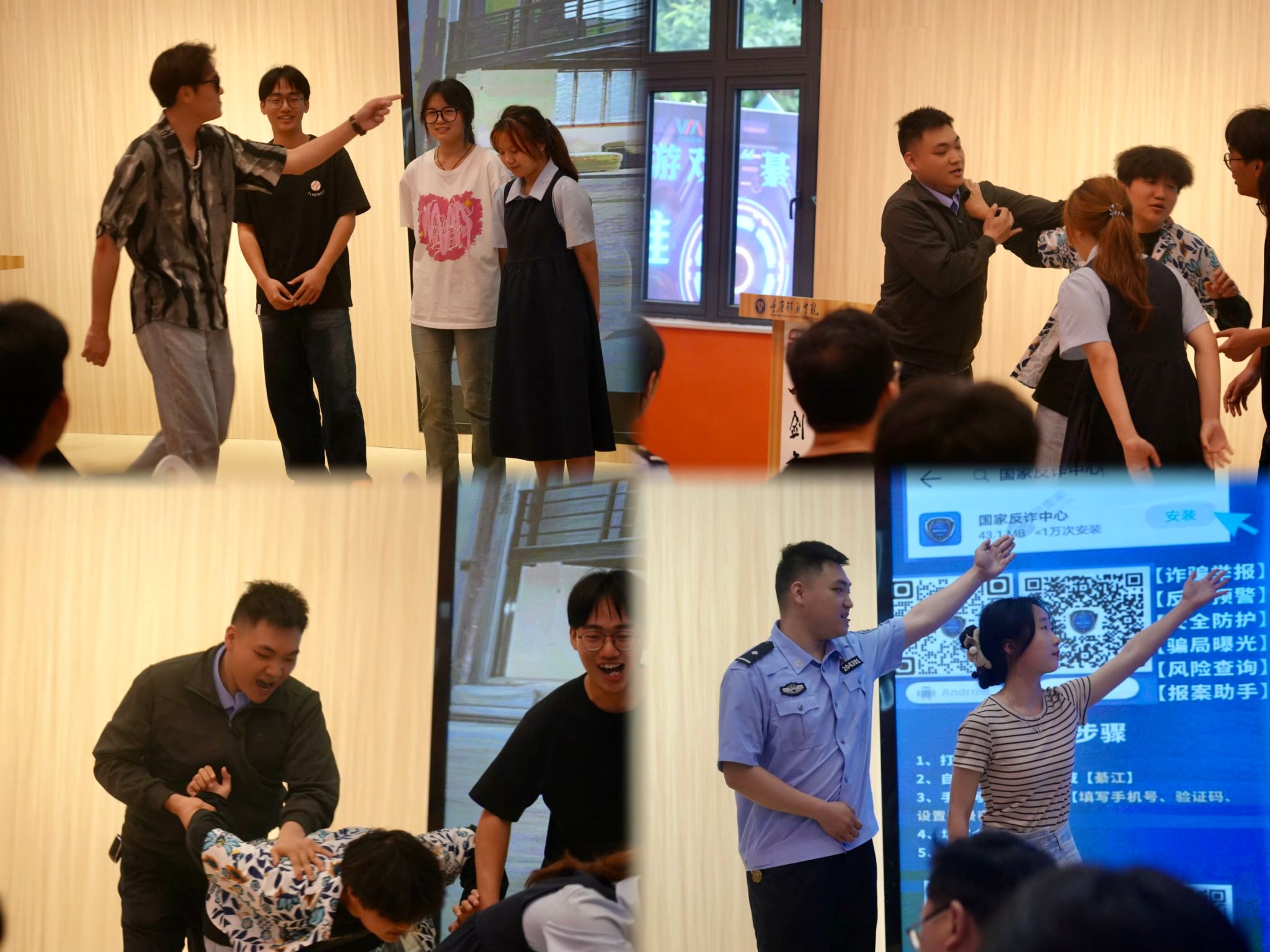 在研究所外围报告厅,由綦江区反诈中心警官同志与戏剧影视学院綦浪有戏话剧社14名演员共同排练的反诈情景剧《奖学金风波》正式上演,剧目讲述了被害者杨帆(吕博饰)收到奖学金短信被骗5000元,报案后当地反诈中心警官(朱宇警官饰)潜入诈骗团伙成功挖出诈骗集团并顺利追回被骗资金的故事。将近一个月的排练淋漓尽致地呈现了大学生遭遇网络诈骗背后的触目惊心。未来3天,院线热播反诈影片《孤注一掷》《猎屠》《巨额来电》也将相继在报告厅上映,进一步强化师生防骗识骗的意识和能力。