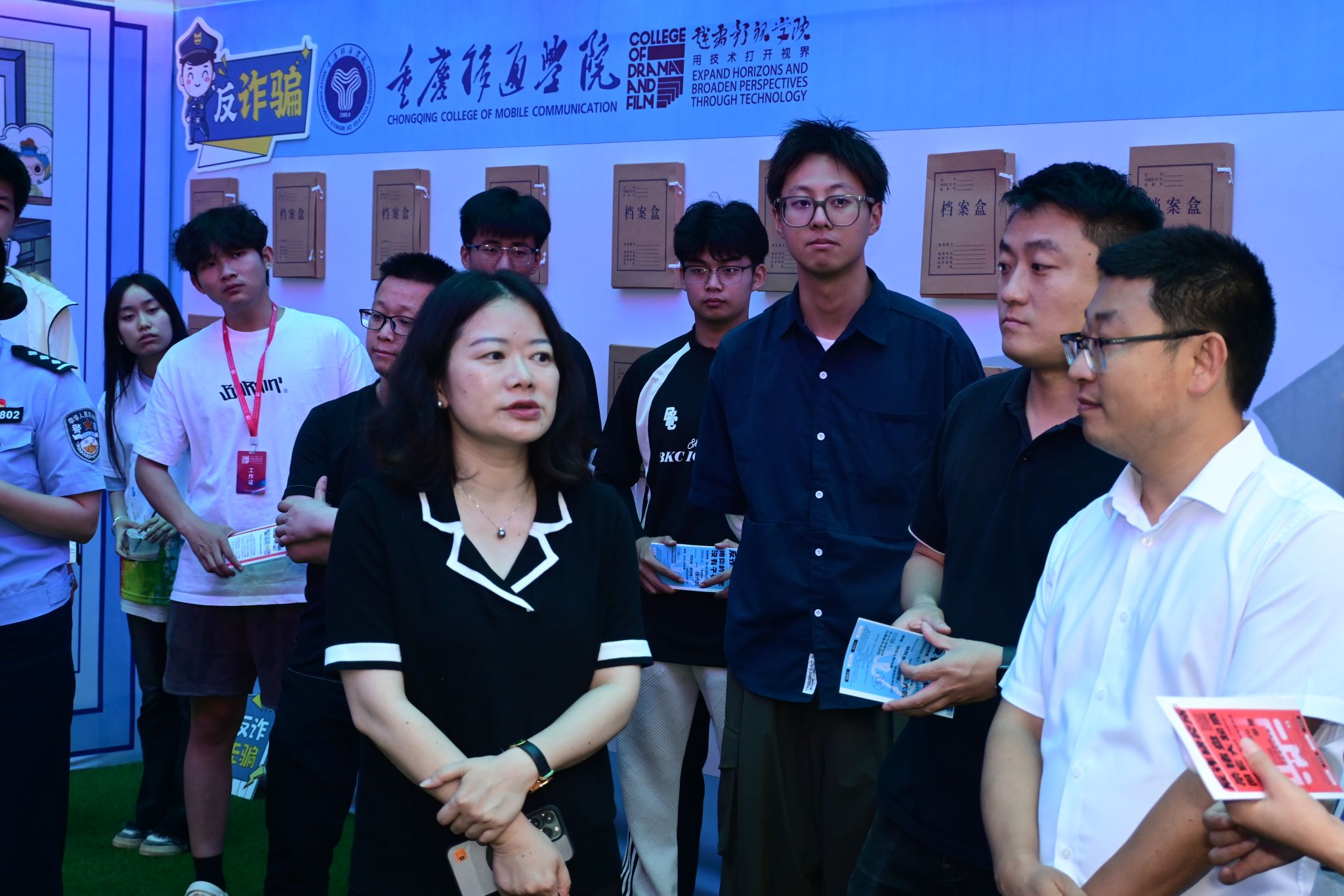 团綦江区委朱泽东、綦江区反诈中心何容容、移通学院团委蔡星宇、戏剧影视学院王芳一行走进活动现场,与同学们一同感受校园反诈氛围,交流反诈宣传教育。戏剧影视学院副院长王芳提到:“将学生专业特长和兴趣爱好融入反诈防诈宣传,在提高专业实践、完满学生的大学生活的同时,也为服务学校、服务社会奉献青春力量!”团区委副书记朱泽东对反诈研究所给予了高度评价,他表示:“团区委将打造更多平台,促进学生校内实践成果走出去和校外社会资源引进来,努力将反诈防诈意识深入綦江千家万户!”