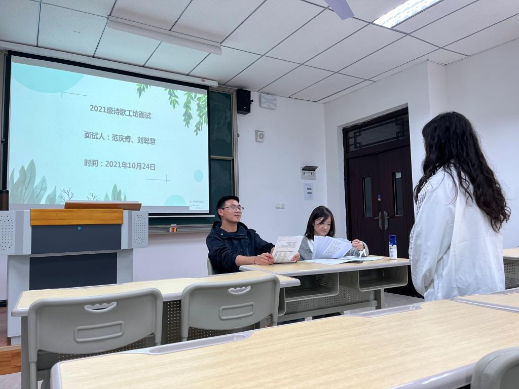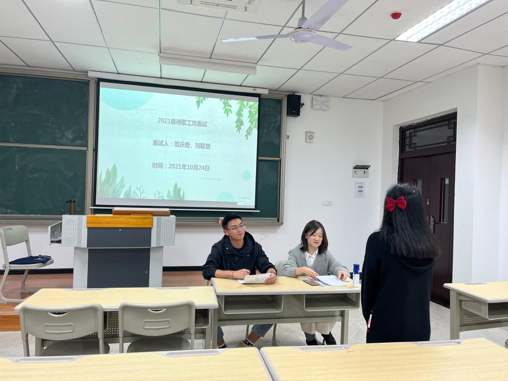 诗歌工坊进入面试环节的学子们最多,范庆奇老师与搭档刘聪慧老师从10月24日的下午六点钟开始面试,直到晚上十点多才送走最后一位面试者,一个个朝气蓬勃的孩子们进入面试现场,表达着对诗歌和作家班的热爱,这种场景不正是我们这些老师们所期待的吗?面试结束后,范庆奇老师与刘聪慧老师还不走,在面试现场筛选着能被最终录取的学子,讨论着每个学子的表现,他们疲惫,可他们脸上写满了骄傲。