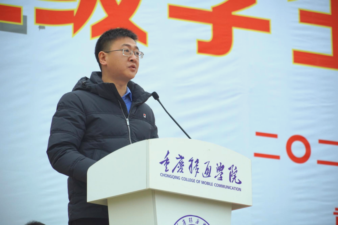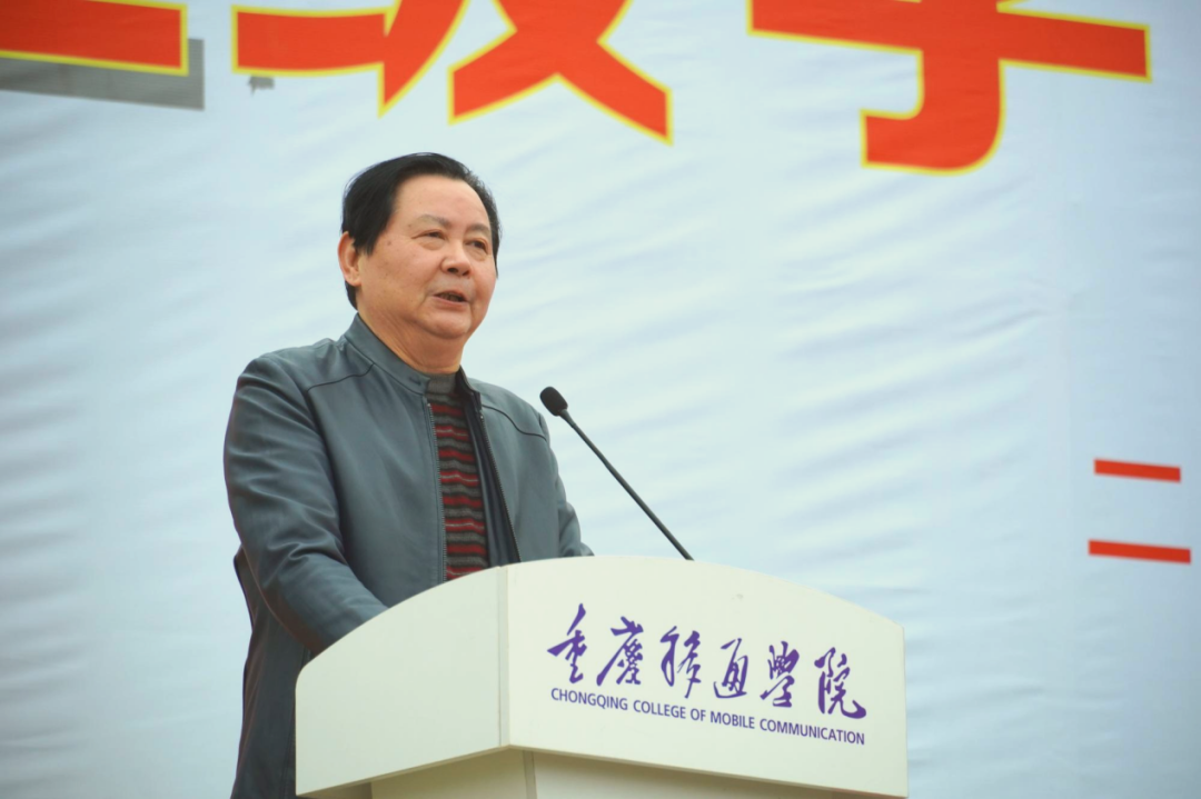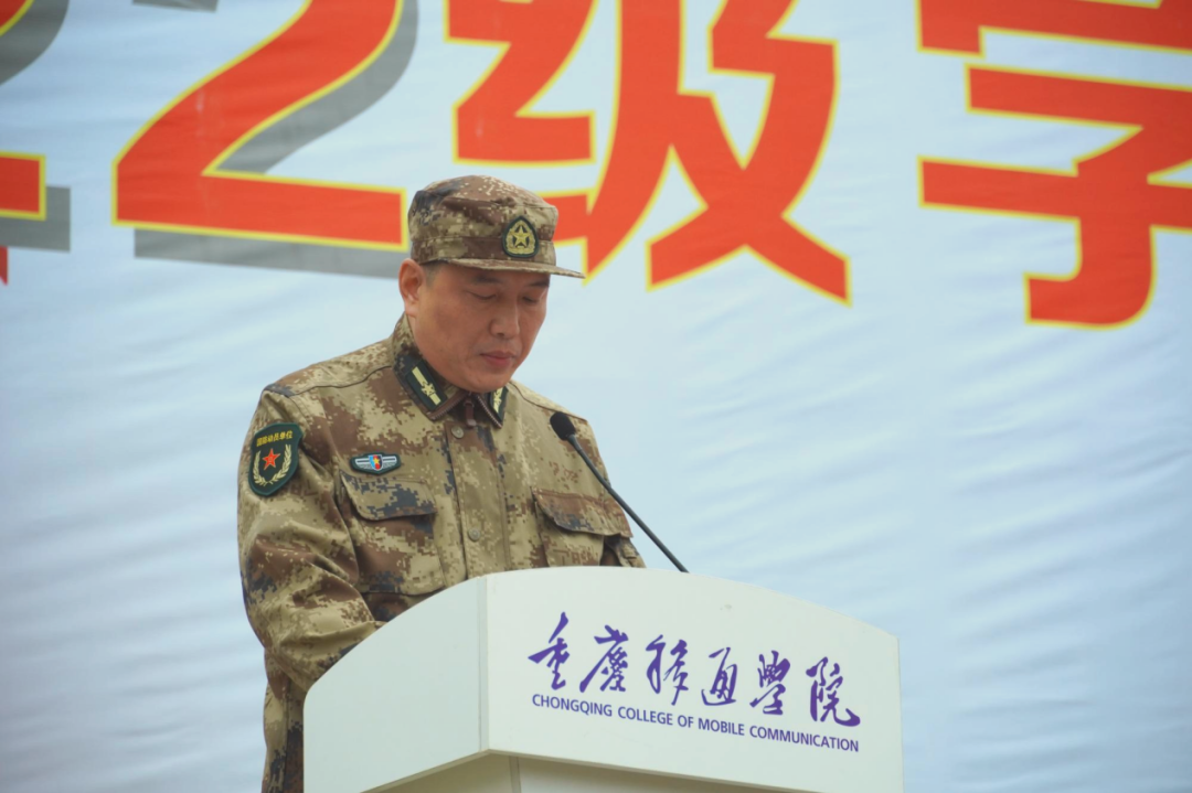 重庆移通学院校长张德民教授讲话,首先他代表学校党政向全体承训教官致以崇高的敬意!向支持我校军训工作及国防教育的綦江区人民武装部和通惠街道人民武装部表示衷心的感谢!