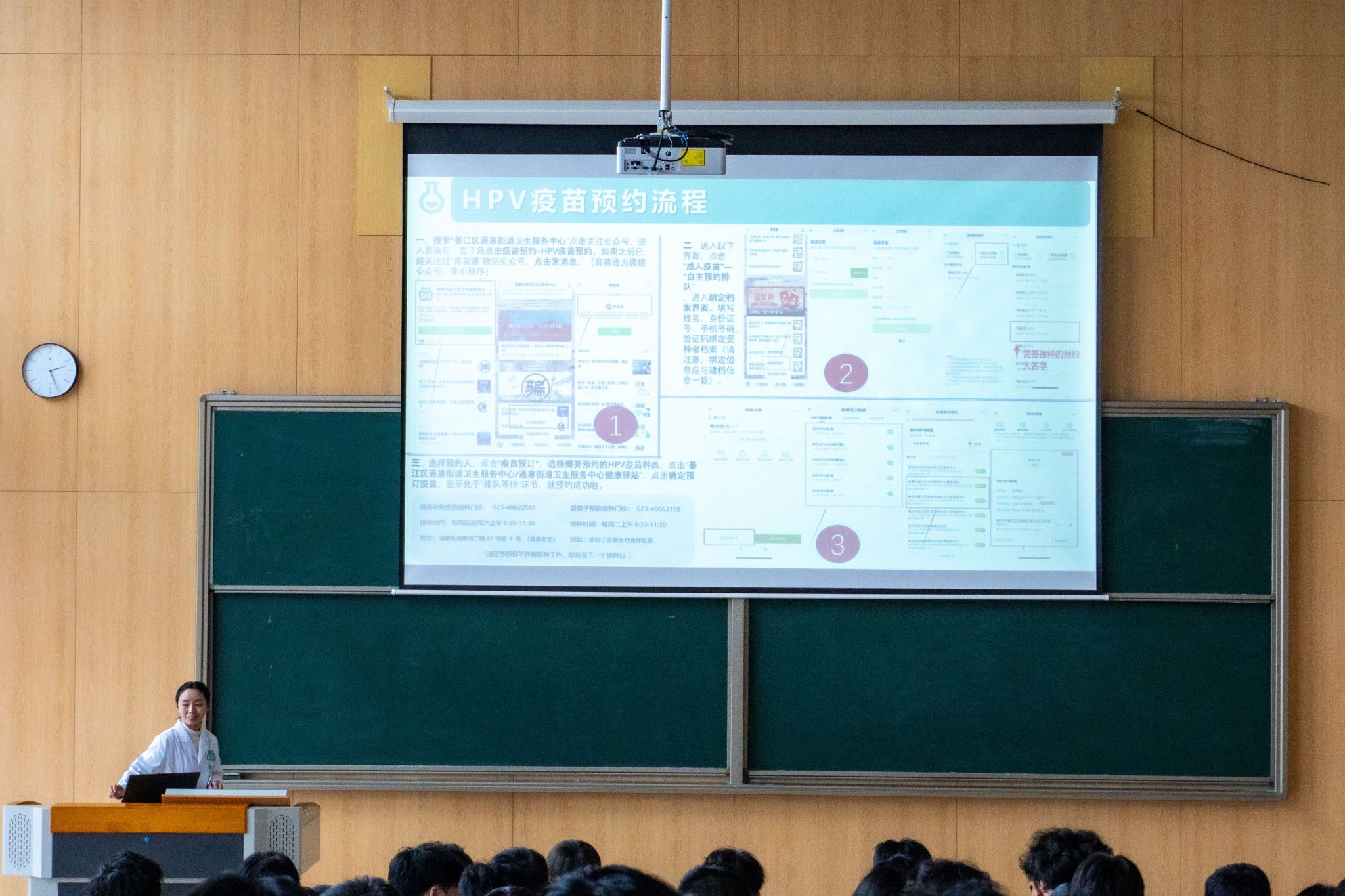此外,邹医生还向大家详细阐释了宫颈癌的致病元凶—HPV,以及HPV的感染方式。为守护大家的宫颈健康,邹医生传授了一些实用的宫颈癌预防方法,如注意个人卫生、避免不洁性行为、普及安全套的正确使用方法,加强个人锻炼等,除此之外,部分适宜接种HPV疫苗的人群应及时接种疫苗。由于HPV感染但还未发展成癌症之前不会有任何症状,定期筛查是唯一能早期检查出病变的方式,所以她强调一定要定期去医院体检。本次讲座普及的知识让学生们受益匪浅,同学们不仅对宫颈健康有了更深刻的认识,并且也学会了HPV疫苗的预约流程,学会更好地爱护自己,为今后的健康生活奠定了坚实的基础。