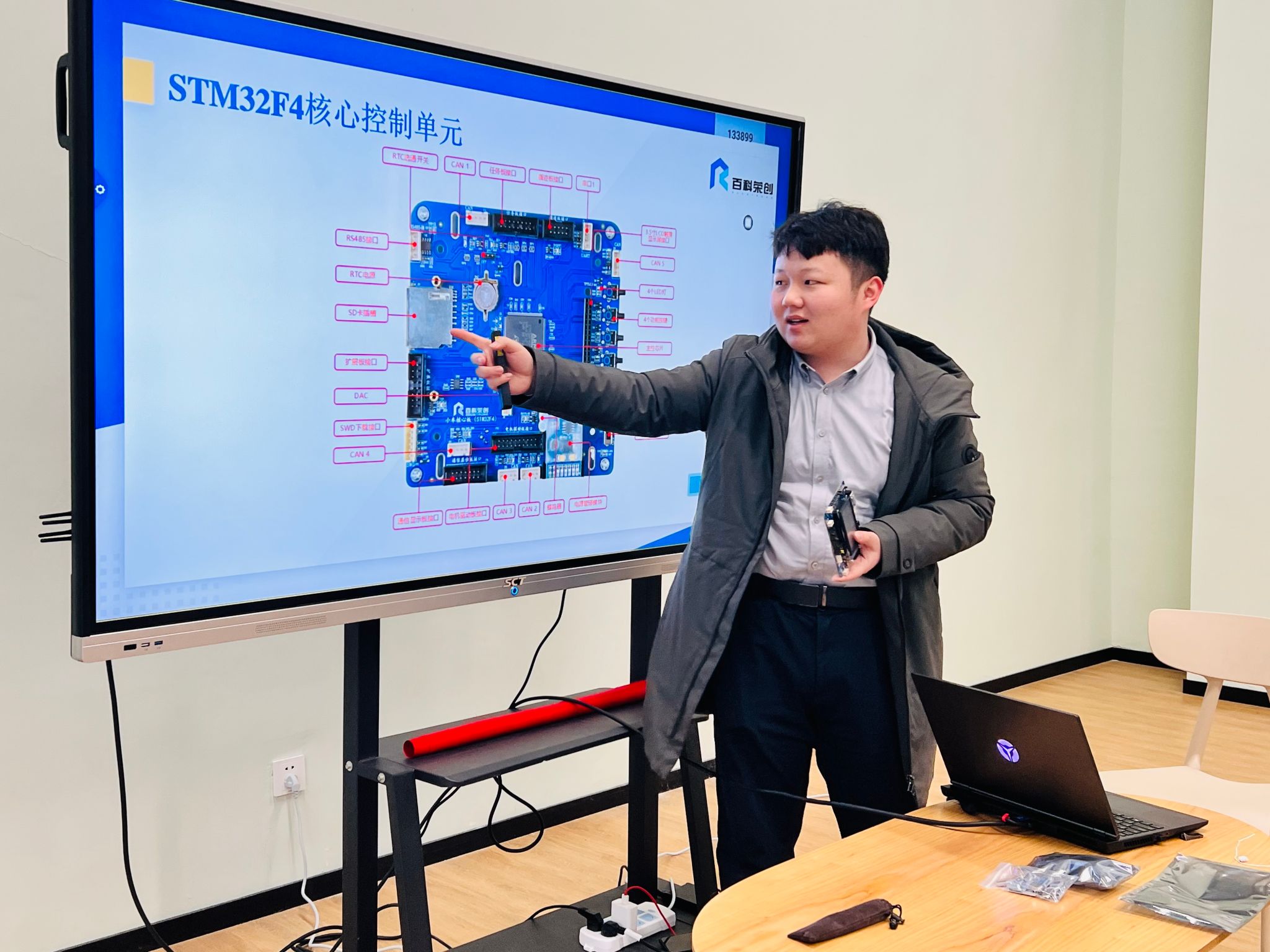 作为本次培训的主讲老师,百科荣创的刘昕钰工程师在仪式上做了简短的发言,他表示,将结合自己的实践经验,对STM32芯片进行深入的讲解,帮助老师们更好地掌握嵌入式应用技术的核心知识和技能。