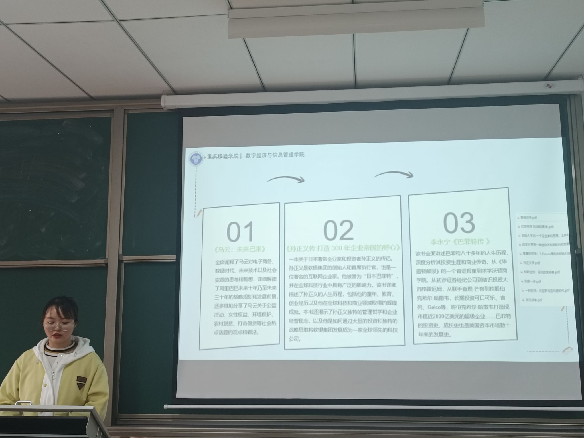 本次活动分享的书籍是《马云:未来已来》《孙正义传:打造300年企业帝国的野心》《巴菲特传》,其中主要分享了《马云:未来已来》,主持本次活动的是数字经济与信息管理学院的夏欣老师,数信学院的全体专任教师出席了本次活动。
