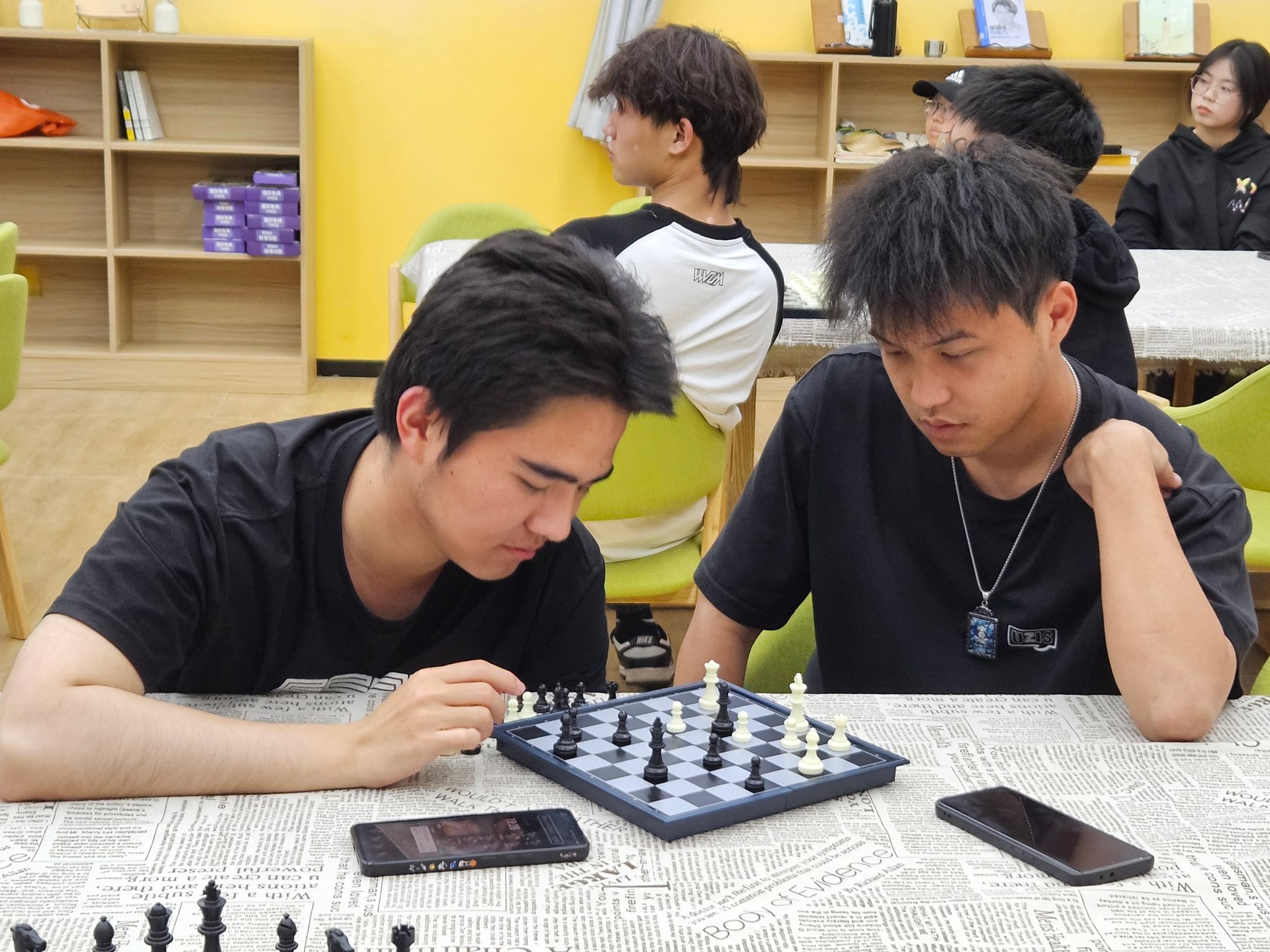 以规则为首,仔细学来,才觉国象规则与中象是有异曲同工之妙。正方形棋盘中均匀分布着64个黑白格,正中央似有一条“河界”将棋盘划为对立相斥的两个地界。一王一后、两象两马两车以及冲锋在一线的八个小兵,16枚棋子各司其职,分工明确却又相互配合,在黑白异色的棋盘格内打的不可开交,参与者们听的津津有味,仿佛阵阵厮杀近在眼前。更有“王车易位”“小兵升变”等特殊规则,甚为博人眼球。