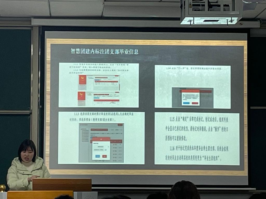 培训会上,付梦竹老师向大家详细介绍我校共青团组织基本情况,带头梳理我校共青团组织建设中从1月到12月需要完成的工作任务,具体讲解团支部书记“背靠背”满意度测评、春季推优入党、团代会、重庆“两红两优”评审,校内五四(先进集体和个人)评优表彰,团总支及十佳五四红旗团支部答辩评选、完超展演评选、市级团干大比武、团组织关系线上线下转出(智慧团建转出毕业生团组织)、线上线下建立新团支部、班团一体化、接收新生团员智慧团建线上转入录入和分配支部、团员发展、线下转入注册、补办团籍团员证、收缴团费、完满超级团支部、秋季入党推优、团支部“对标定级”自评整顿、年度党史学习录入、检验学社衔接率等21项基础团务工作内容和要求;此外付老师还深入讲述了“三会两制一课”以及《中国共产主义青年团章程》的具体内容和准则,引领师生们要遵守章程,以标准文件为做事参考,一步一准则。