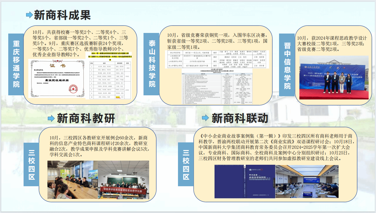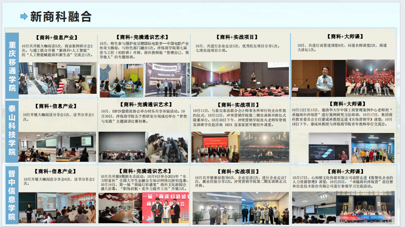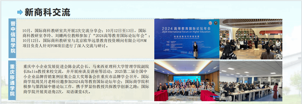 10月,三校四区商科教育板块围绕新商科的“商科+”模式开展各类教学教研与实践活动90余次,大咖分享及宣讲活动21次,高管进课堂10次,商科类讲座(问道、商道、淬炼之路、泰山商道等)共6次,访企拓岗交流12次。《中小企业商业故事案例集(第一辑)》印发三校四区用于商科教学,2025第二届全国中小企业品牌营销案例征集公益大奖筹备会在重庆市品牌学会召开,冲突营销学院实训班(第二期)全部开班,重庆中小企业发展促进会、马来西亚理科大学等领导前来交流,重庆移通学院和晋中信息学院教师代表应邀参加2024年高等教育国际论坛年会。