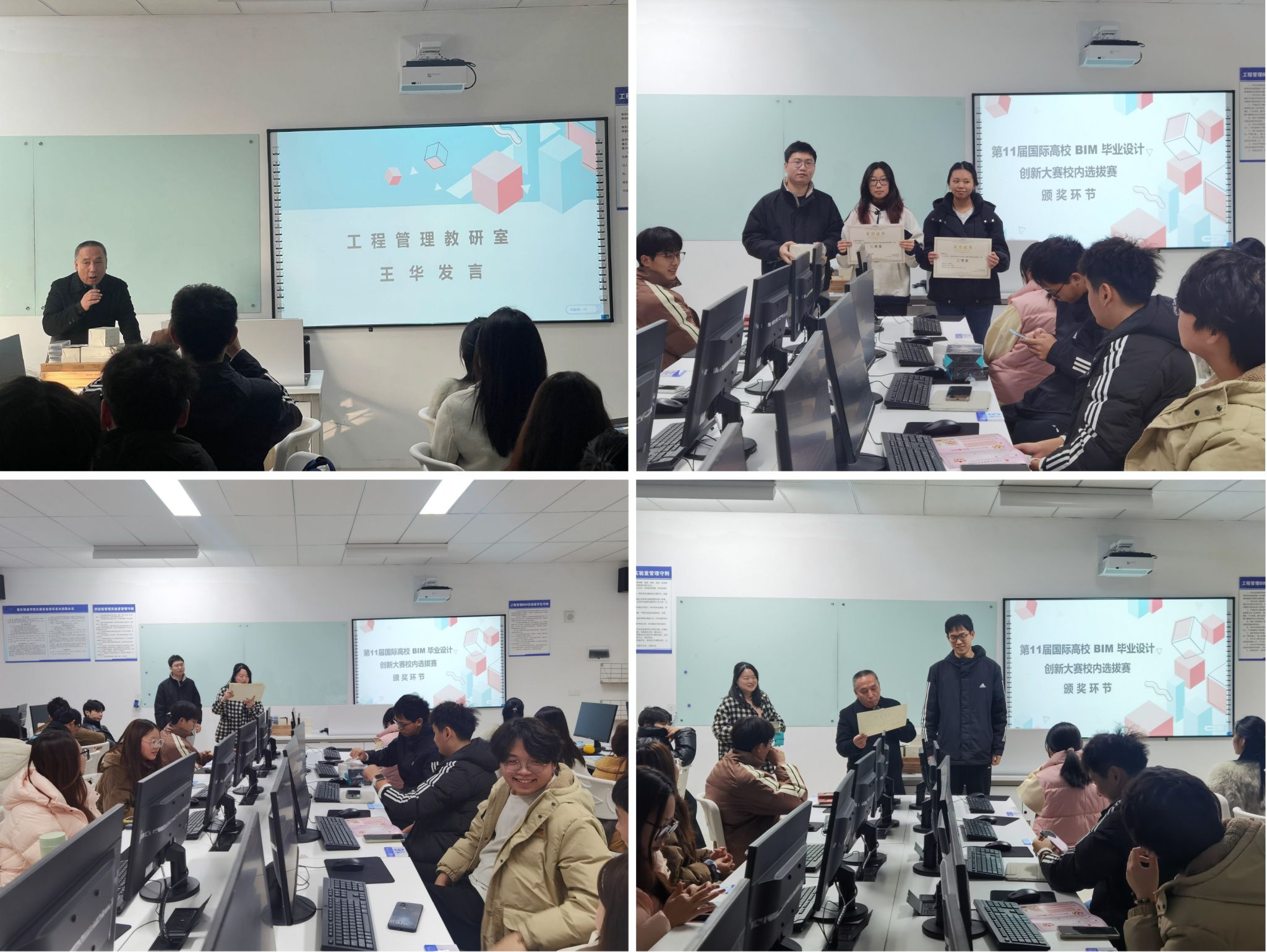 由中国土木工程学会建筑市场与招标投标研究分会、国家数字建筑行业产教融合共同体与广联达科技股份有限公司联合主办的“第十一届国际高校BIM毕业设计创新大赛”正在校园赛阶段。数字经济与信息管理学院承办了本次大赛的“重庆移通学院校园赛”,2024年11月27日下午14点,在贤者楼327圆满举行了校园赛比赛暨颁奖仪式。出席本次比赛的为报名参加校园赛的全体学生和工程管理教研室全体教师。