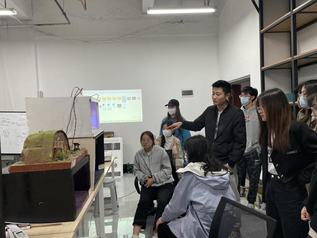 何德江老师接着给同学们讲述这个作品的的设计理念和设计思路。在黑色盒子上方的呈半圆拱型的模型,是一座小屋。据何老师介绍,这个作品的设计理念出自于《指环王》霍比特人的小屋。在我们的影视作品中,给我们总体印象霍比特人的小屋就是一个小小的土堡,门前有一个不大不小的院子,周遭在围上一圈栅栏。这个作品在同学们中也是深受大家的喜欢,同学们围聚一圈,细细的欣赏着细腻而又精致的手工作品。