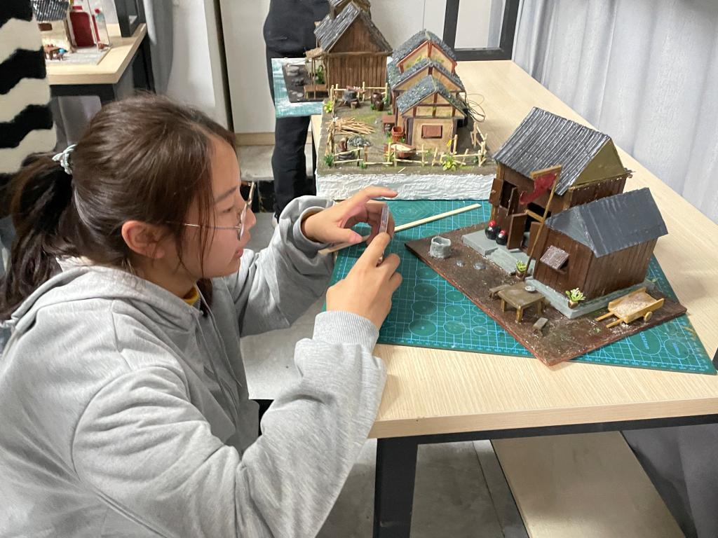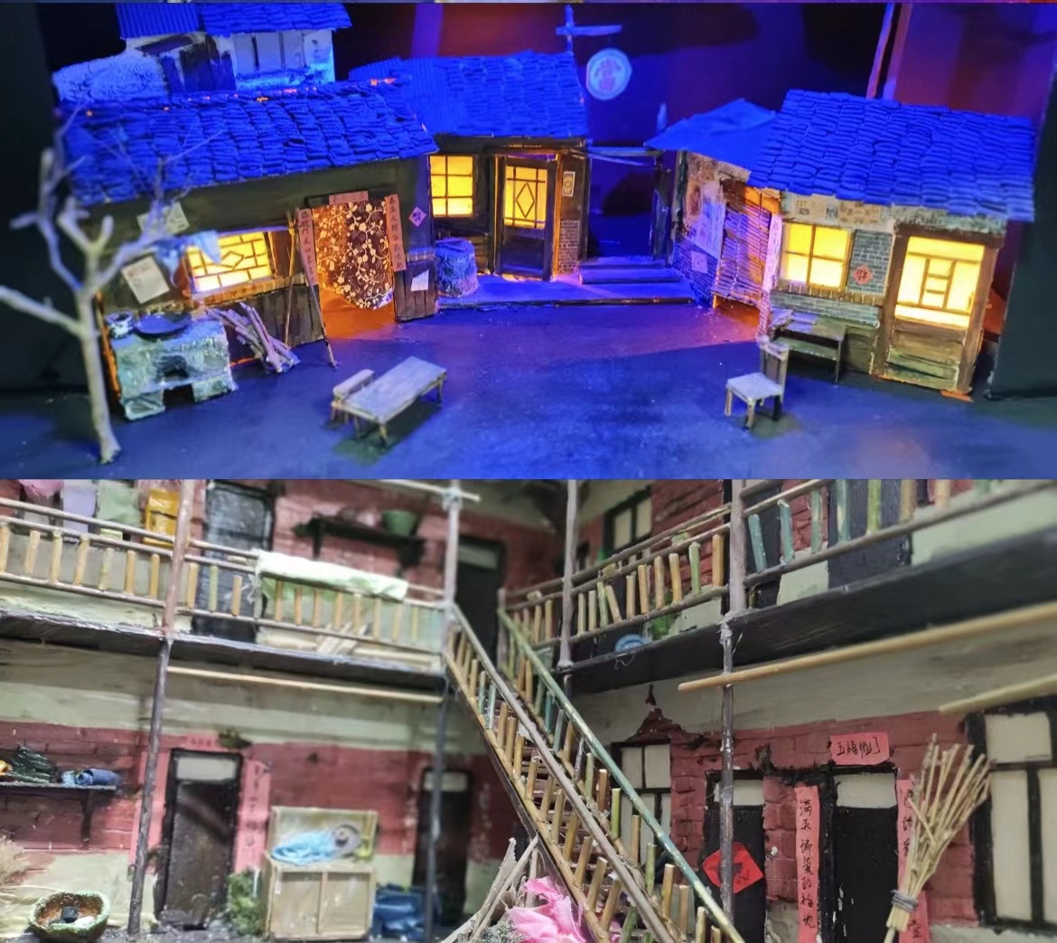 何德江老师为学生解说舞台框架及结构。该舞台为原创音乐剧《破晓》的舞台美术,格外精致与协调。何老师介绍到,有此视觉效果并非是以实物为实验品搭建,而是在舞台搭建前由同学们设计及在老师的指导下,在诸多事先演练与设计下利用各种材料以及废物搭建而成的一个细微精致的模拟舞台,从而构建起实际舞台。同学们都被眼前的精美作品所吸引,这些手工艺品的原材料都是取自我们的日常生活中,那些不起眼的小玩意儿,经过大家的思考,通过种种方法,变成我们眼前精致的作品。