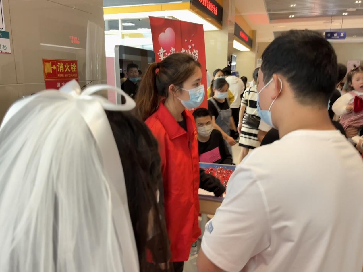 以爱之名,以余生为期。在繁忙的间隙,工作人员来到志愿者们身边,为志愿者们普及婚姻相关的知识,方便她们能够更好的解答新人们的问题,同时还增长了志愿者对相关知识的了解,拓宽了知识面。拿到结婚证的新婚夫妇们来到志愿者身旁,凭借着结婚证和身份证领取永生花和彩票,志愿者奉上礼物,并传达最真挚的祝福。永生花和彩票不仅是为了得到一个好彩头,更是他们婚姻幸福的见证物。志愿者们被包围在一个充满爱的环境下,用满怀爱的心去见证一对对新人,祝福一对对新人。