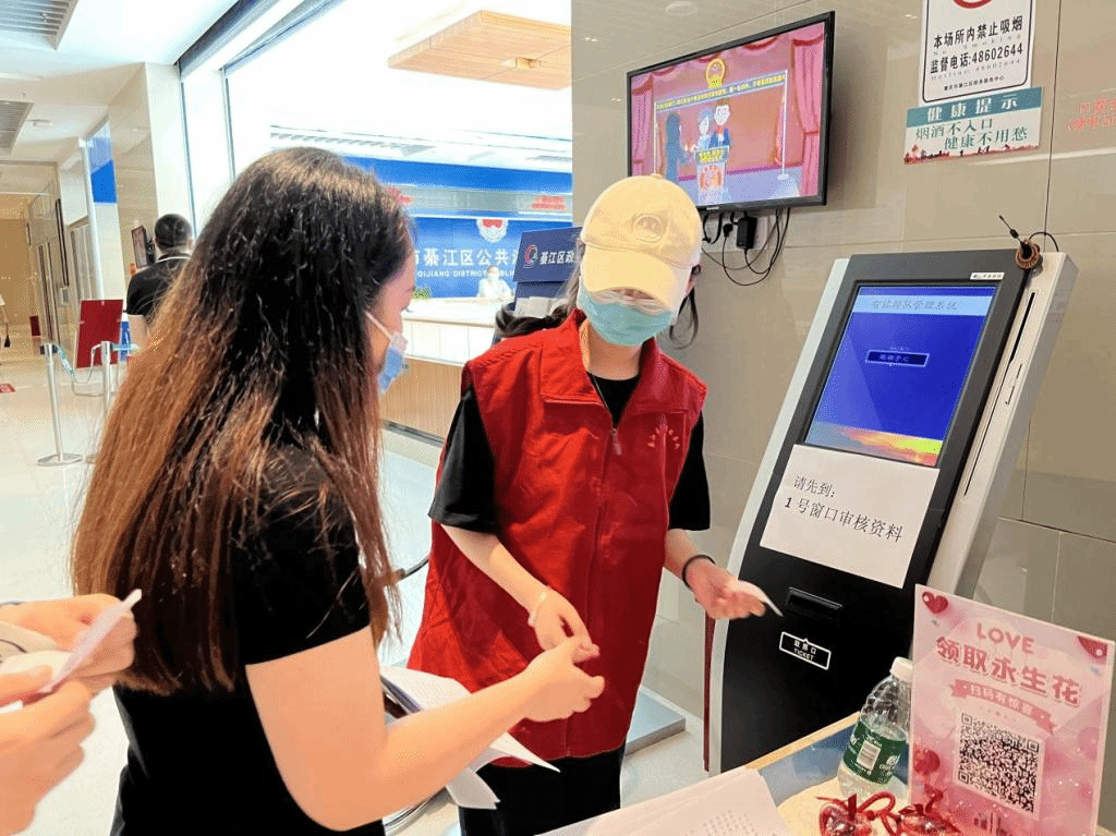 时间为媒,青春为聘。一早,民政局门口就已经排了长长的队,为了推进领证登记进度、减少人员聚集、缩短新人走程序时间,志愿者在取号机前为登记结婚的新人们取号,并指引他们进行后续的登记流程;当新人们前来询问登记相关事宜时,志愿者们也耐心为他们解答,使现场秩序有条不紊。志愿者们看着在她们的引导下,不会因为程序繁多而困扰的一对对新人幸福的笑容,也颇为自豪,同时也被他们的幸福所感染,送上最真挚的祝福。