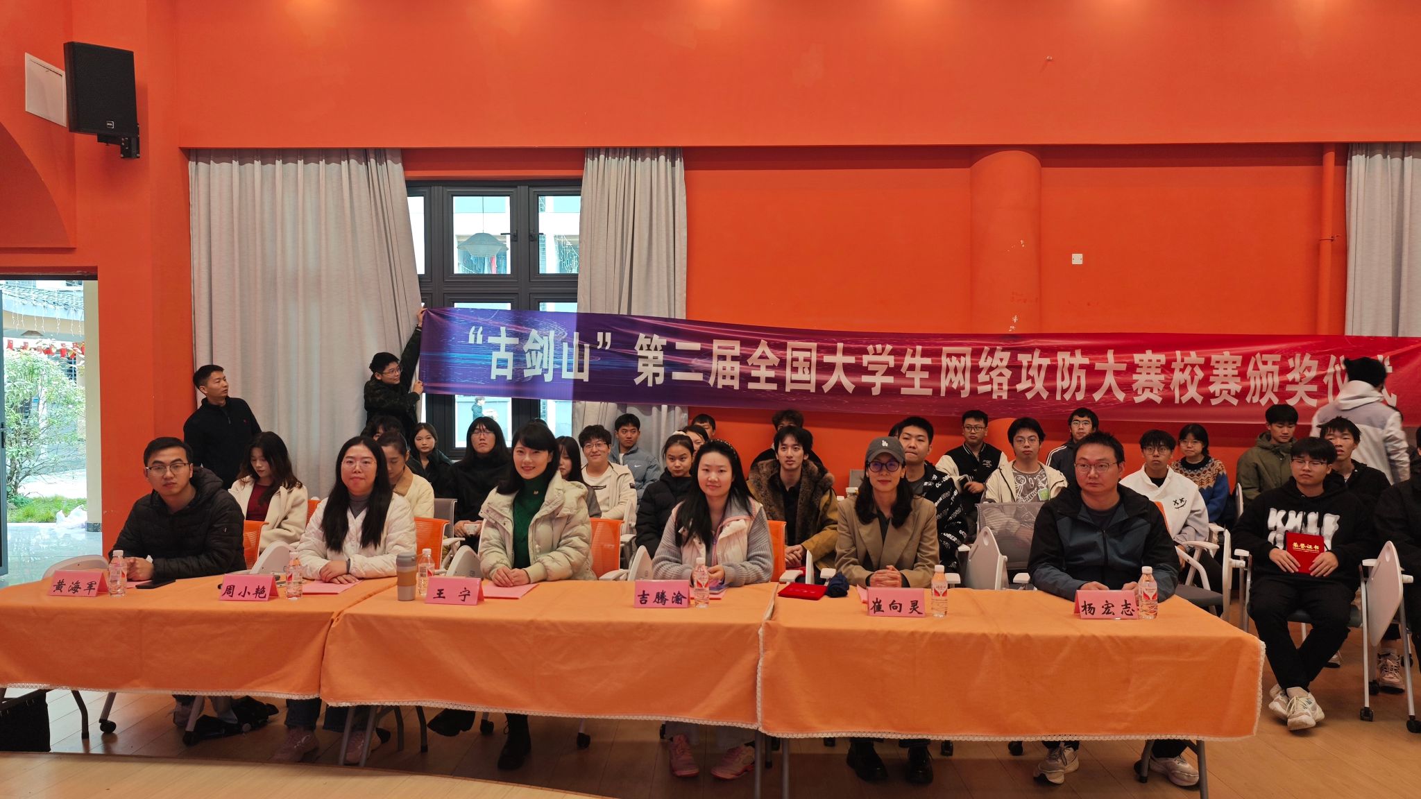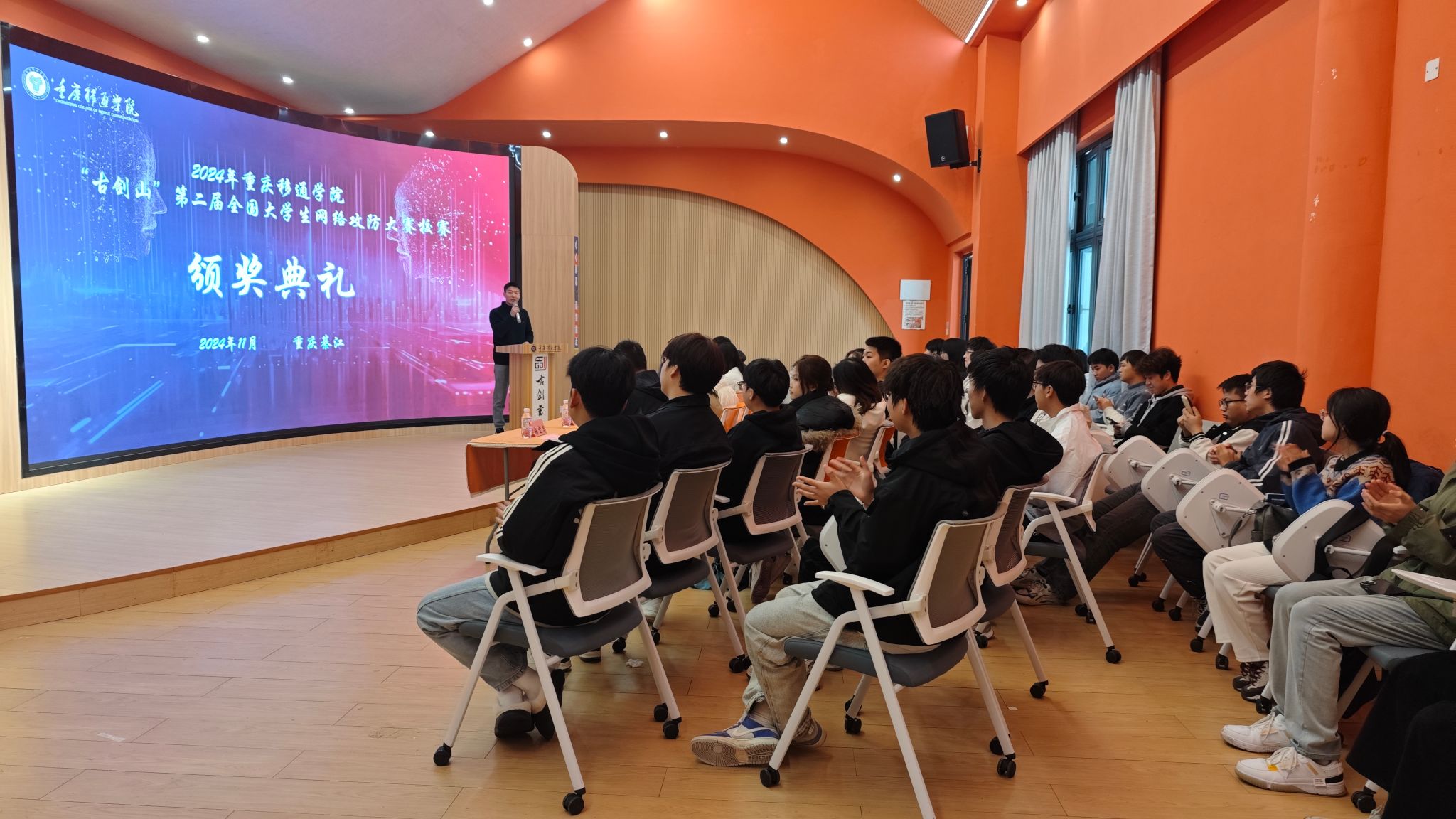为进一步增强大学生的网络安全创新意识、安全技能和团队协作方面的综合素质,重庆移通学院信息安全学院举办了“古剑山”第二届全国大学生网络攻防大赛校赛。此次大赛吸引了全校多个学院不同专业的53支队伍,154名学生参赛,选手们通过多轮激烈角逐,展现了卓越的网络攻防技术与团队协作能力。为表彰在比赛中脱颖而出的获奖学生,以及为学生提供悉心指导与支持的优秀指导教师,信息安全学院于2024年11月19日中午12时30分,在古剑书院·含光报告厅举办了“古剑山”第二届全国大学生网络攻防大赛校赛颁奖典礼。信息安全学院院长王宁、代理教学副院长周小艳、网络工程教研室主任黄海军、信息基础教研室主任杨宏志、网络与信息管理中心骨干教师游雯婷等嘉宾莅临现场,与参赛学生、优秀指导教师代表以及各学院的师生代表共同见证了这一荣耀时刻。