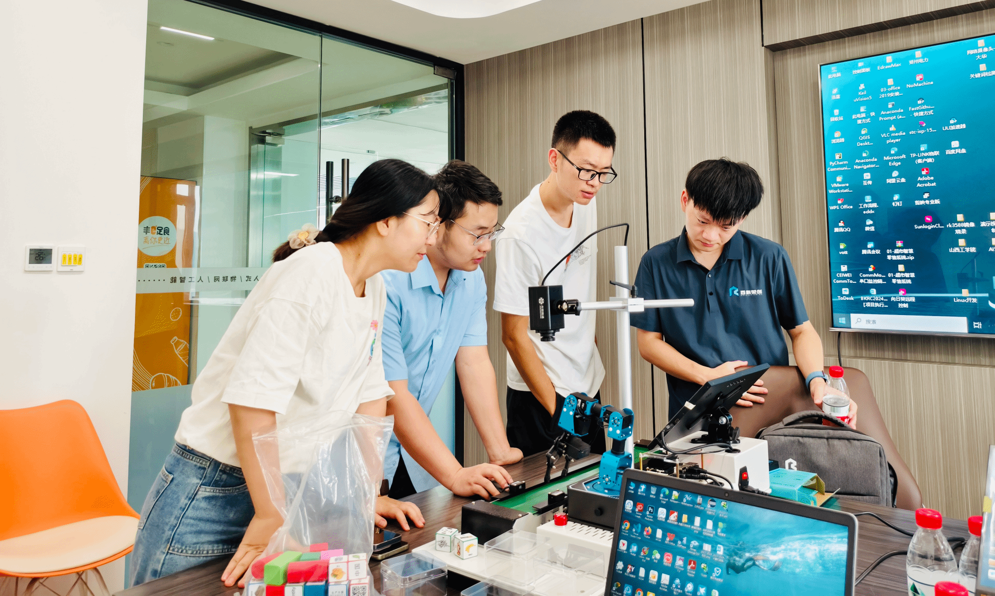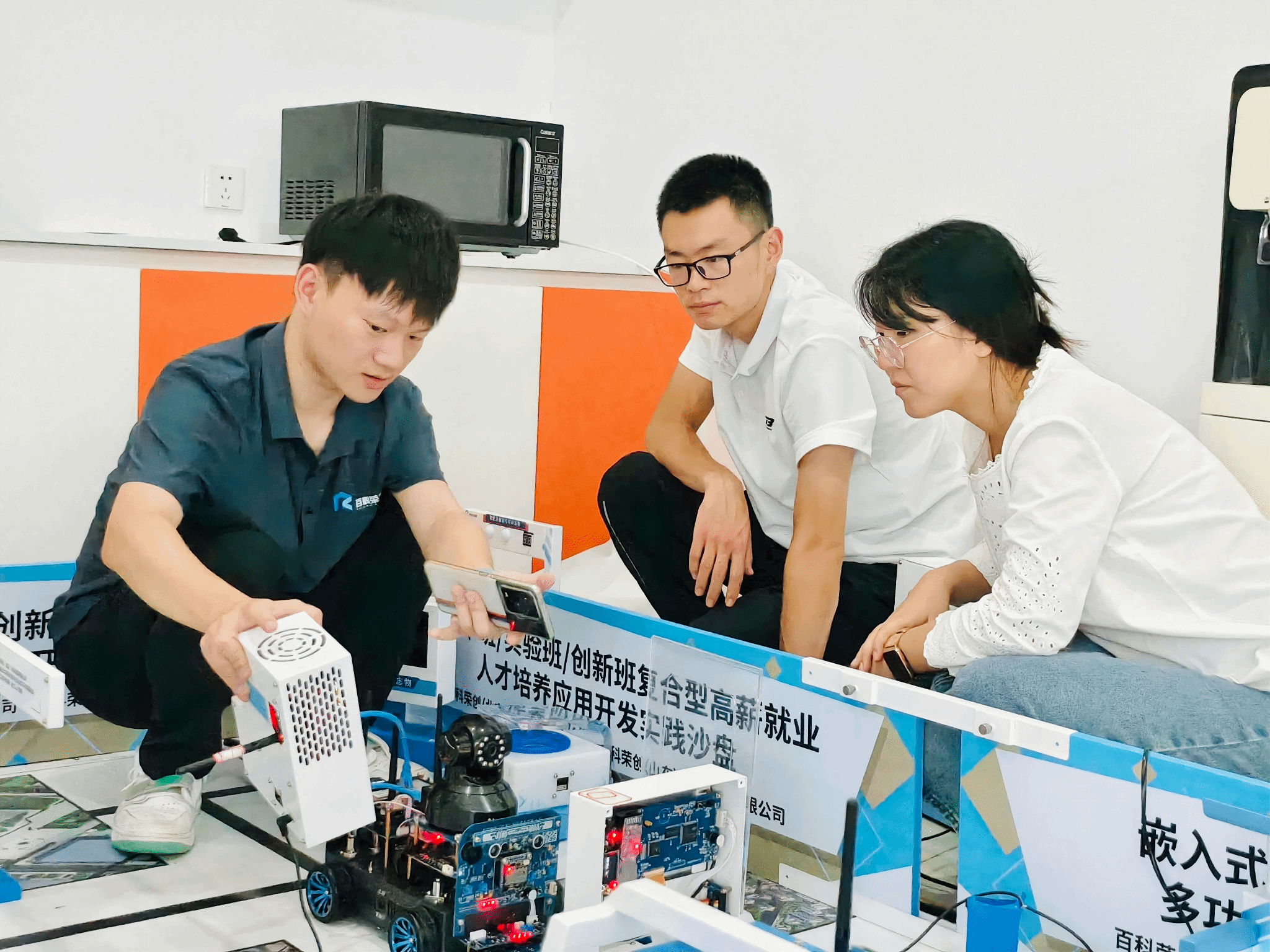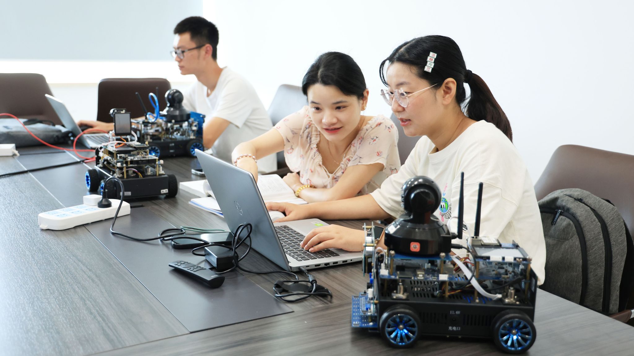廖婧、彭家林、吴圣尧三位老师赴百科荣创(山东)科技发展有限公司,进行嵌入式开发工程师的锻炼。在锻炼期间,吴圣尧老师参与百科荣创公司基于Python技术机器视觉工业应用的开发,学习到了六轴机械臂模型的调试技巧等;廖婧老师参与嵌入式智能车综合应用项目的开发,深入了解到智能车的自动驾驶与寻址过程;彭家林老师参与智能家居系统多人协作综合实训平台的开发,通过软件远程控制智能家居设备等。