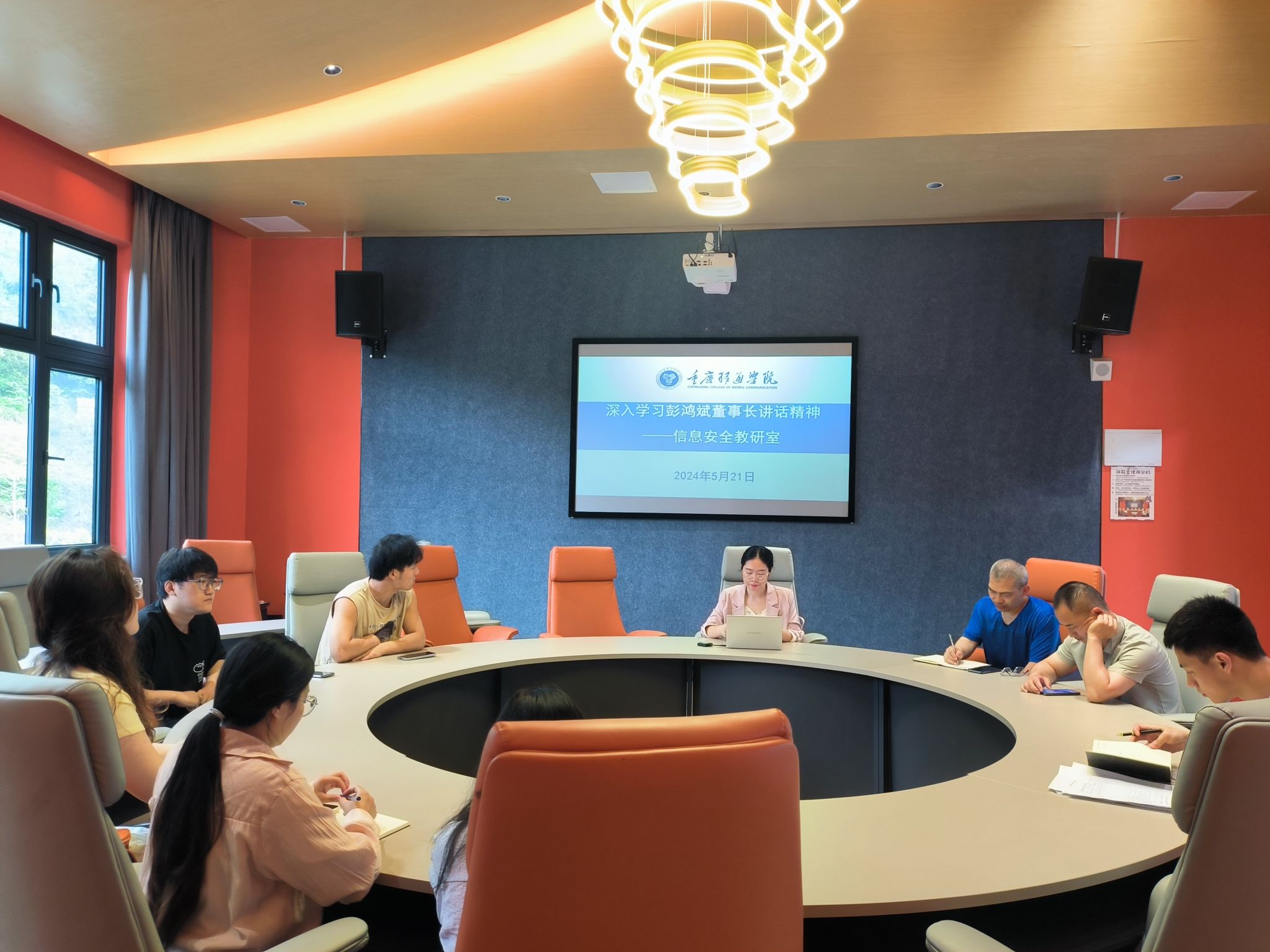信息安全教研室主任周小艳于5月21日在古剑书院龙泉会议室开展带领教研室全体教师认真学习了彭鸿斌董事长讲话文件精神,使老师们更加明确集团战略的目标方向和教育理念,增强了老师们的责任感和使命感。老师们纷纷表示,将积极贯彻董事长的讲话精神,努力提升自己的工作能力和素质,为学校的发展贡献自己的力量。