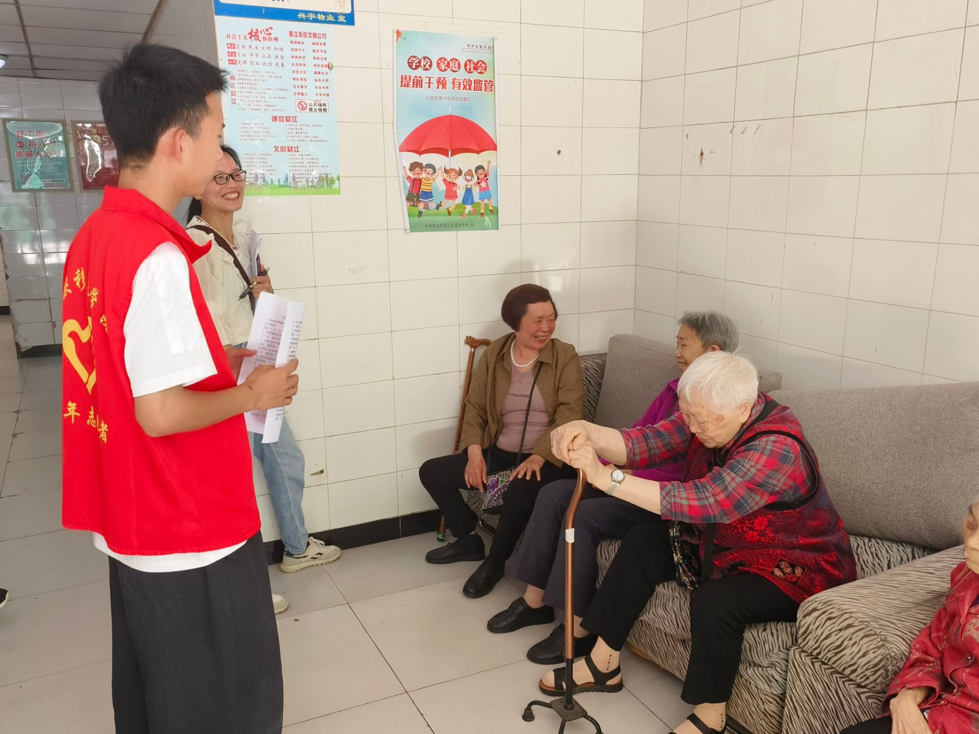 “志愿始于心,奉献在于行。”志愿者们整装待发,统一身披红马甲,整齐有序的一同前往新街子社区综合文化服务中心。走进办公室,大家有序就坐,活动负责人言简意赅的阐述此次活动的任务以及人员分配。社区网格员分别带领已分配好的志愿者们前往居民住所进行创建文明城市的宣传倡导。阳光明媚,笑容洋溢,一路上看到无数温馨闲适的场景。社区网格员带领志愿者们走进他们的身旁,向居民道出前来目的,志愿者向居民念出调查问卷上的问题。